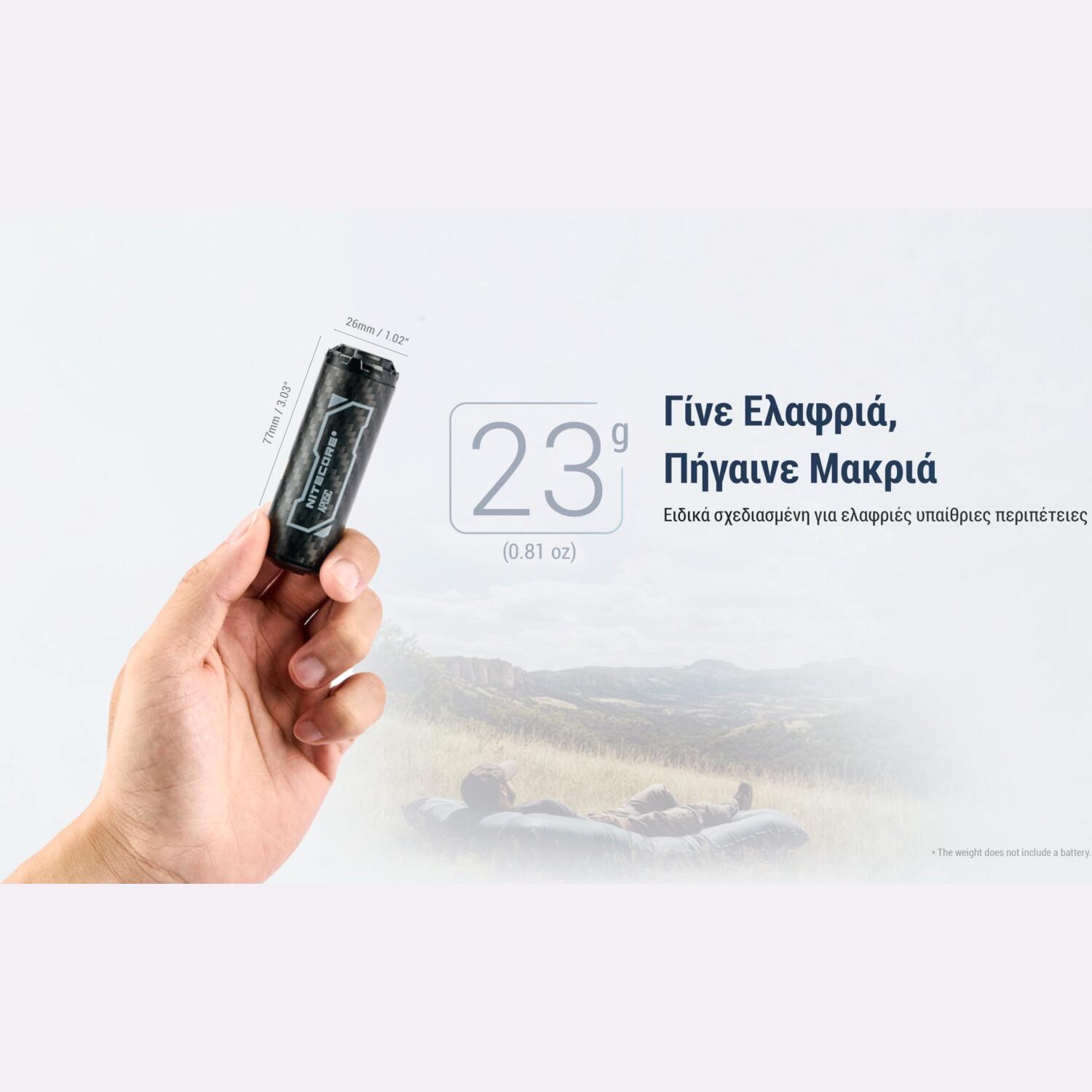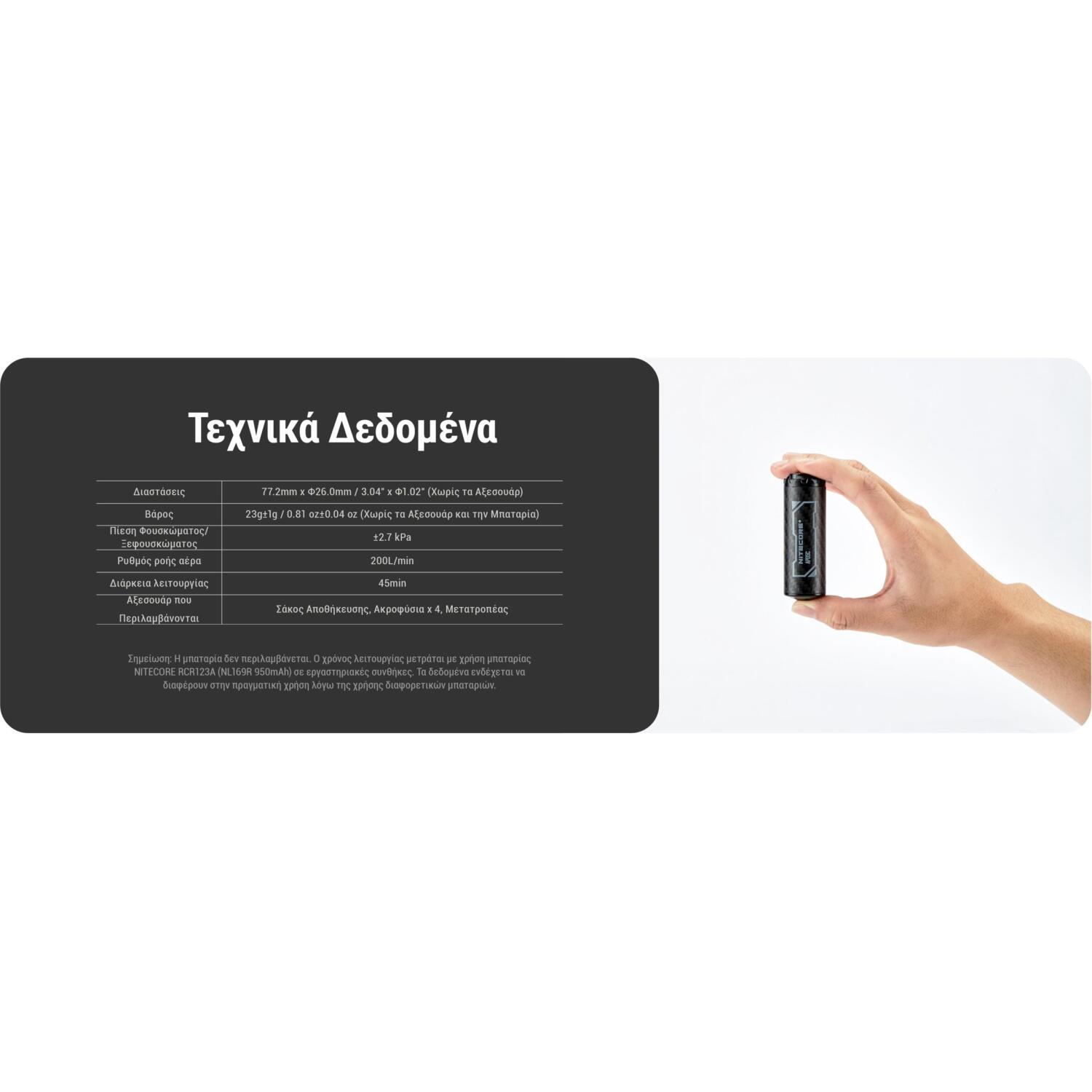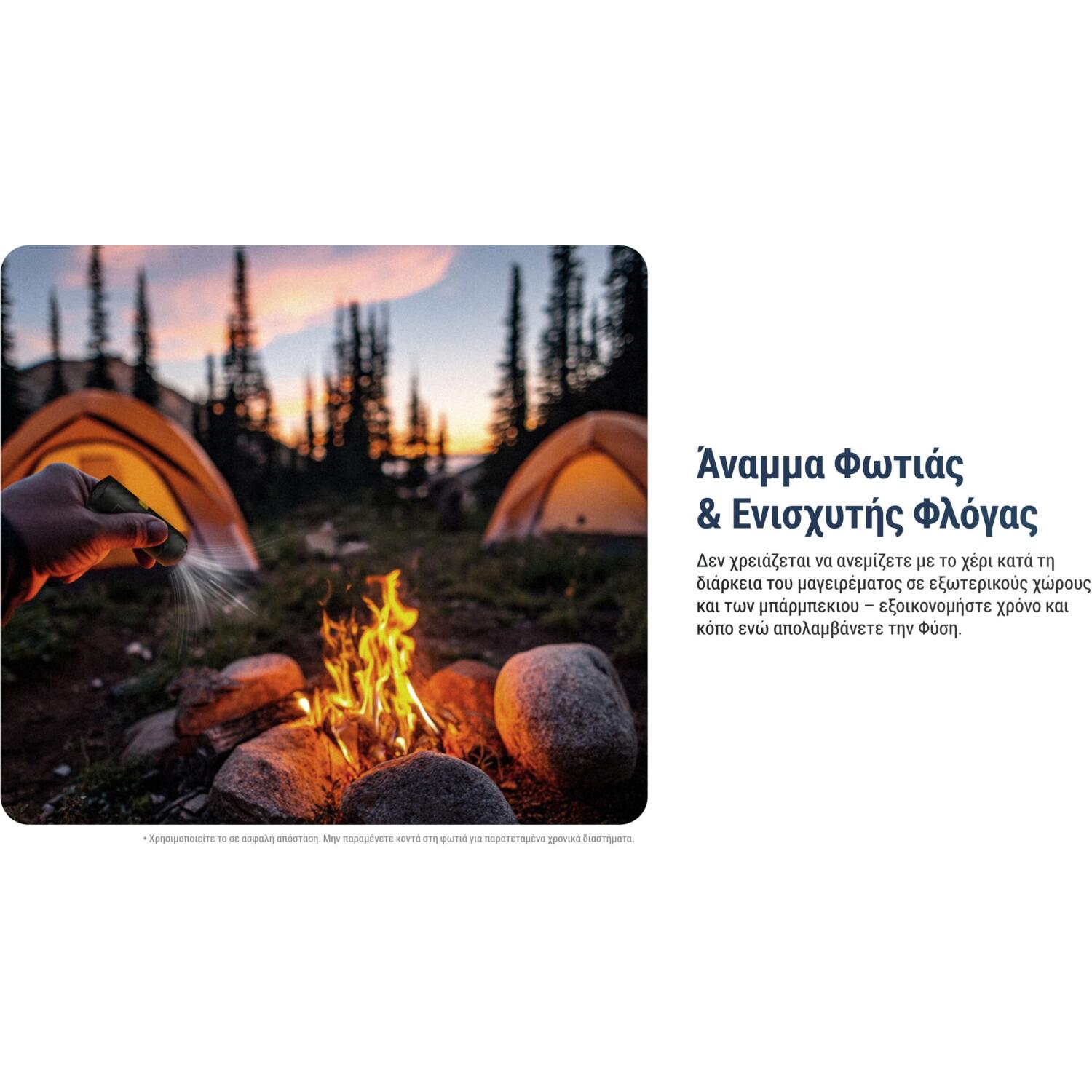 Σημείωση: Συνιστάται η χρήση με μπαταρία Nitecore RCR123A (NL169R 950mAh), η οποία δεν περιλαμβάνεται, είναι επαναφορτιζόμενη μέσω Type-C και έχει μεγάλη διάρκεια ζωής. Για το άναμμα της φωτιάς, χρησιμοποιείστε το σε ασφαλή απόσταση και μην παραμένετε κοντά στη φωτιά για παρατεταμένα χρονικά διαστήματα. Απαιτείται διπλό πάτημα για την ενεργοποίηση της τρόμπας, ώστε να αποφεύγεται η τυχαία ενεργοποίηση.