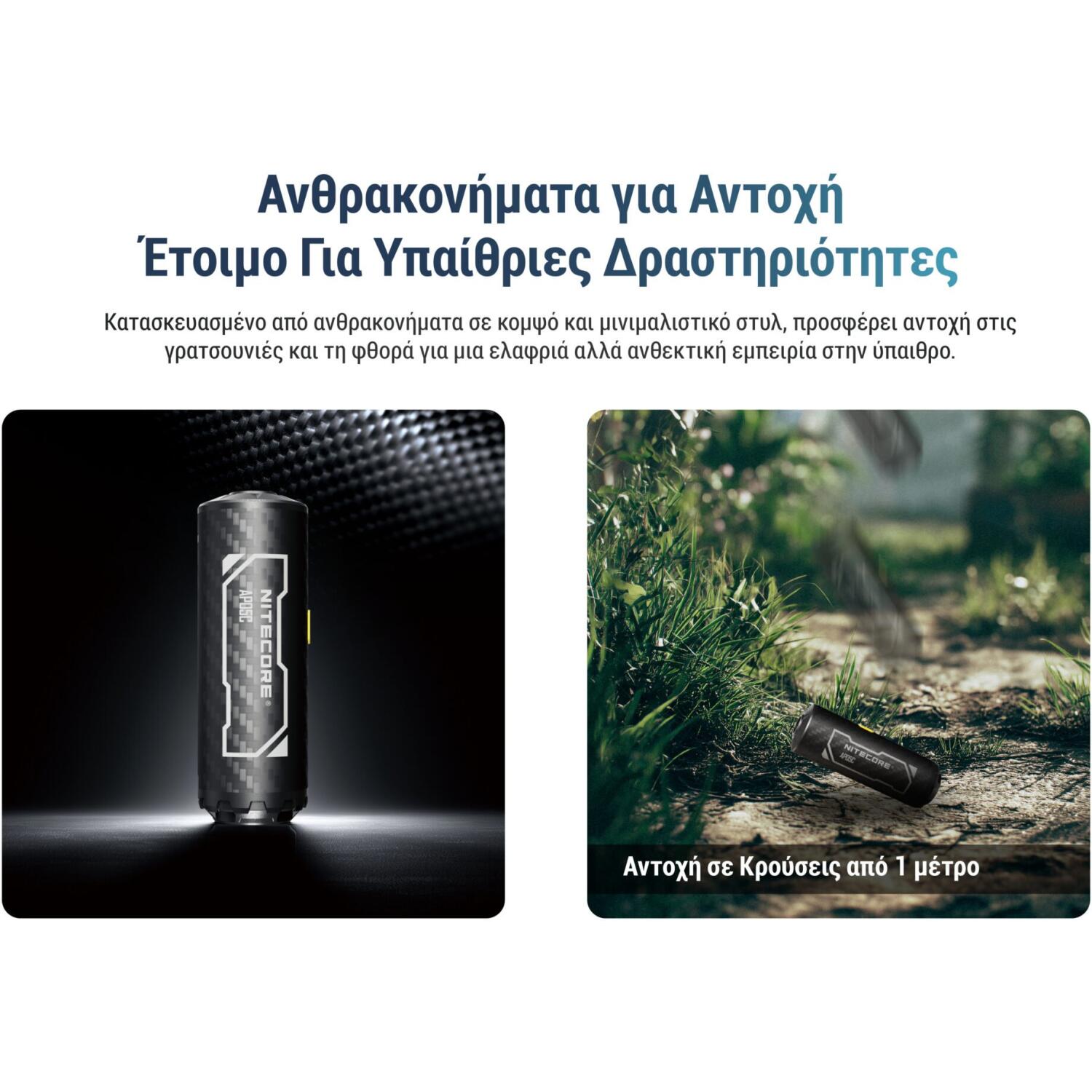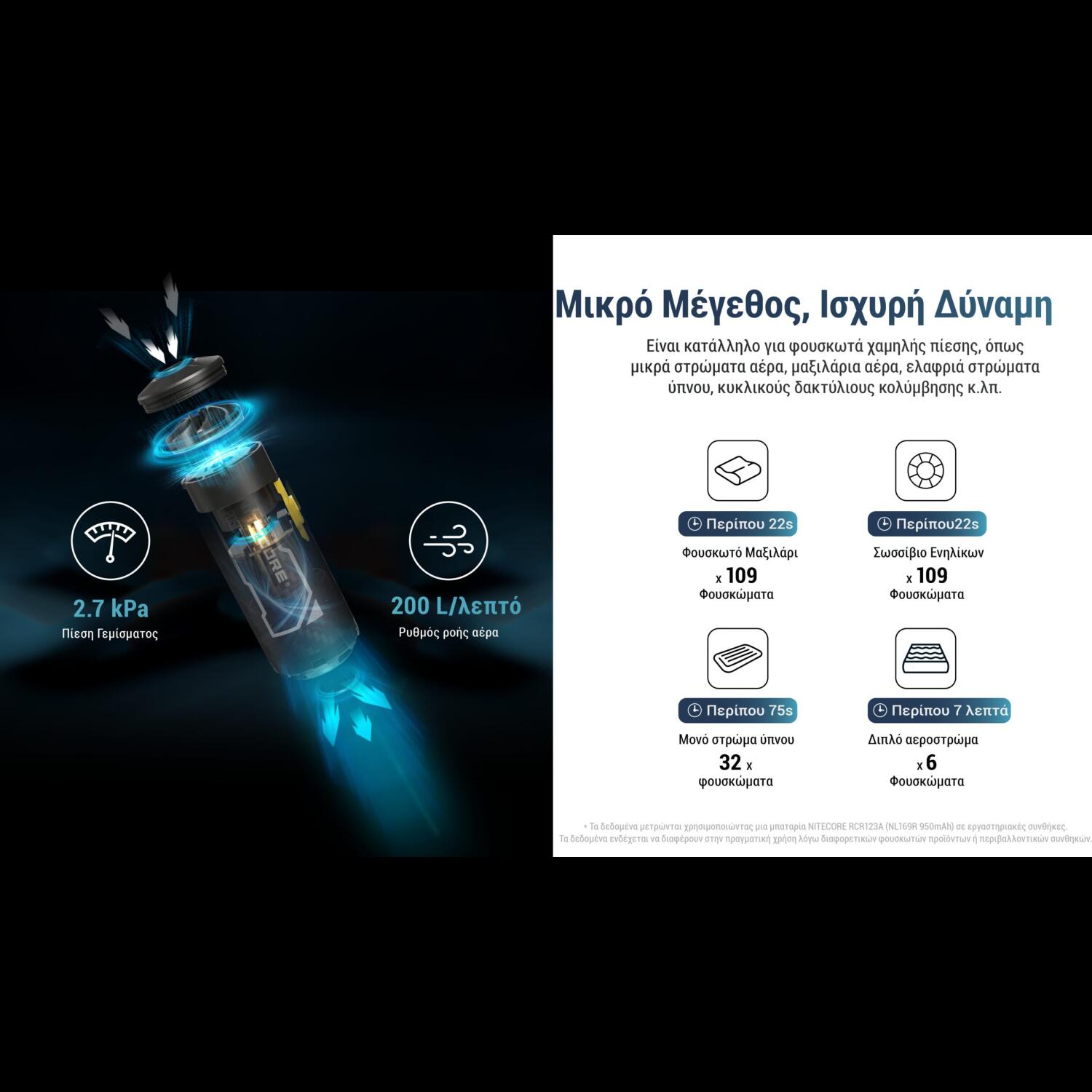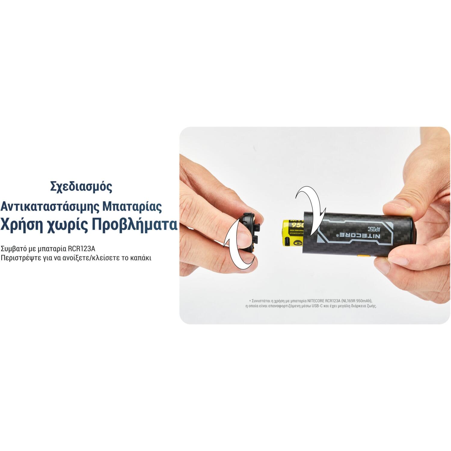 Σημείωση: Συνιστάται η χρήση με μπαταρία Nitecore RCR123A (NL169R 950mAh), η οποία δεν περιλαμβάνεται, είναι επαναφορτιζόμενη μέσω Type-C και έχει μεγάλη διάρκεια ζωής. Για το άναμμα της φωτιάς, χρησιμοποιείστε το σε ασφαλή απόσταση και μην παραμένετε κοντά στη φωτιά για παρατεταμένα χρονικά διαστήματα. Απαιτείται διπλό πάτημα για την ενεργοποίηση της τρόμπας, ώστε να αποφεύγεται η τυχαία ενεργοποίηση.
