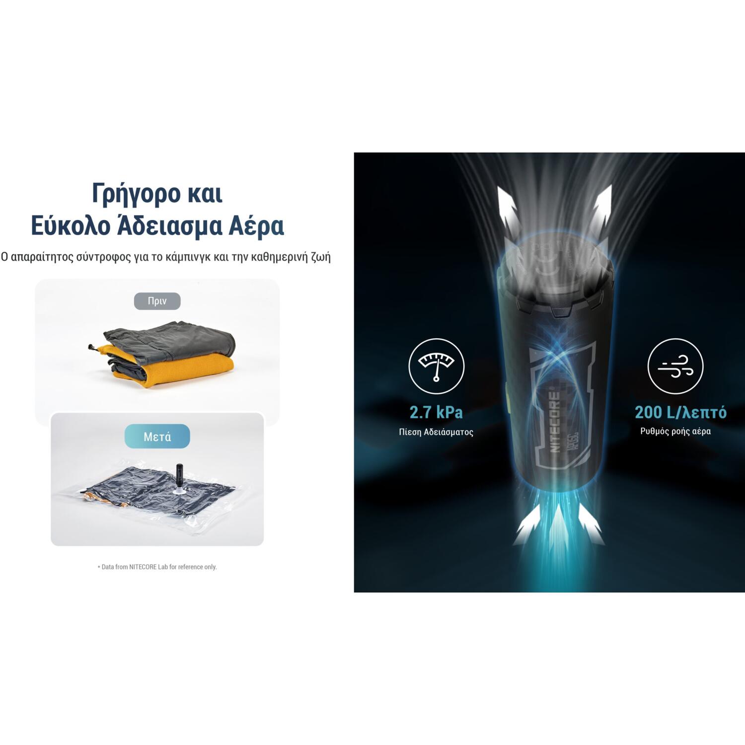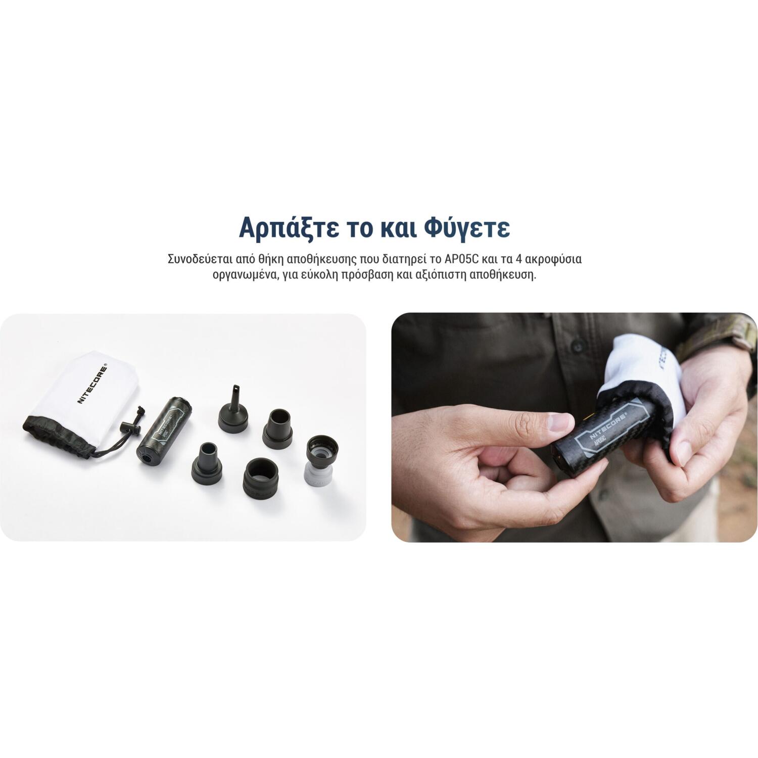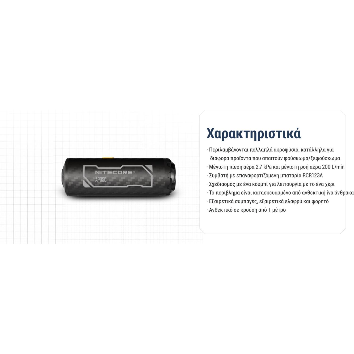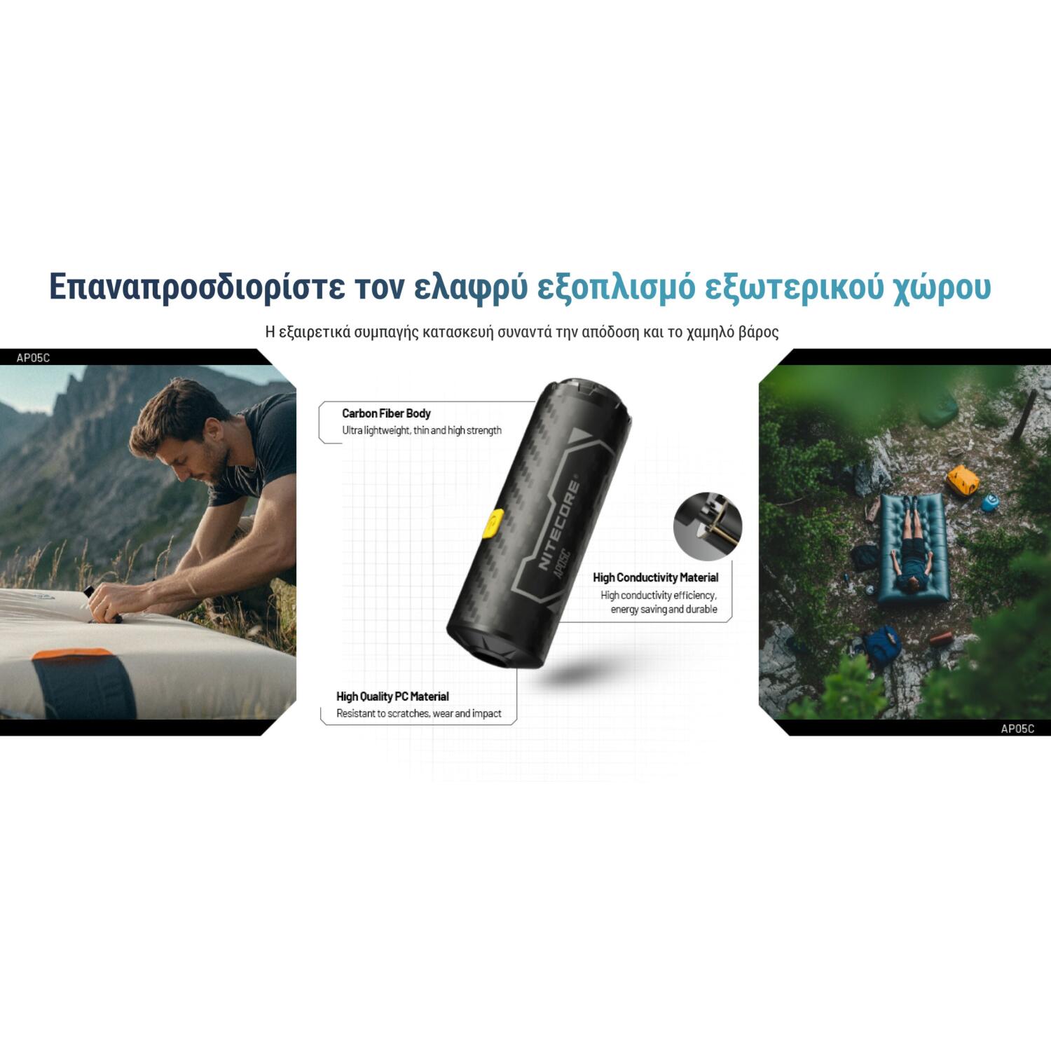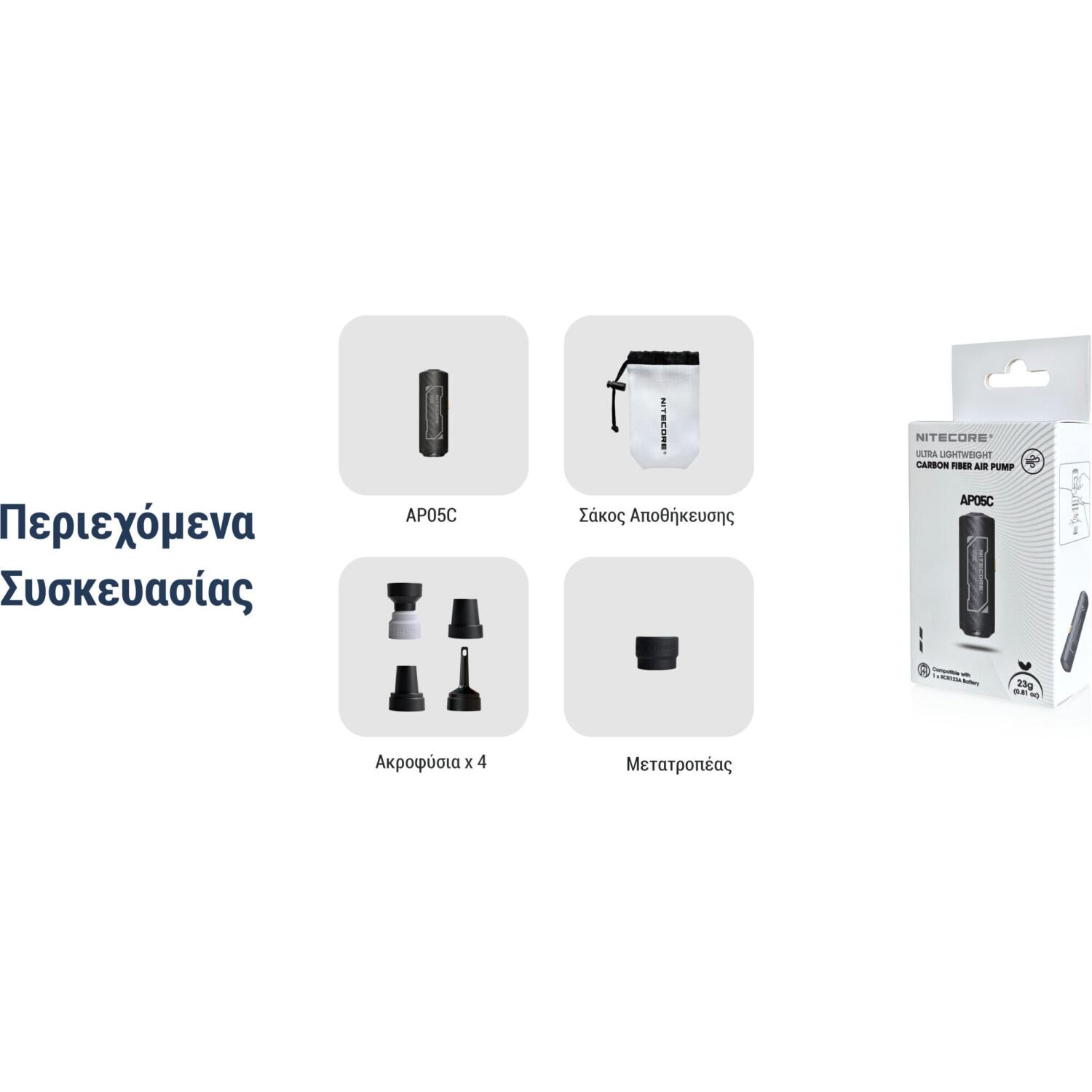 Η ηλεκτρική επαναφορτιζόμενη τρόμπα AP05C Carbon Fiber Air Pump της Nitecore είναι μία εξαιρετικά ελαφριά, φορητή τρόμπα, κατασκευασμένη από ανθεκτικά, υψηλής ποιότητας ανθρακονήματα, carbon fiber, ώστε να αντέχει στην μακροχρόνια χρήση. Με διαστάσεις μόλις 77 x 26 mm και βάρος 23 γραμμάρια, αποτελεί το ιδανικό travel gadget και home gadget.