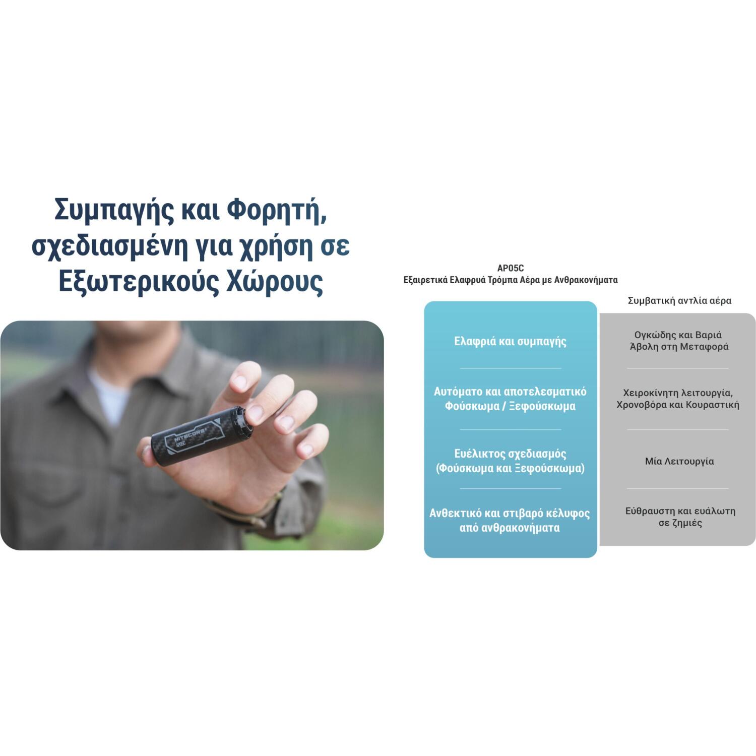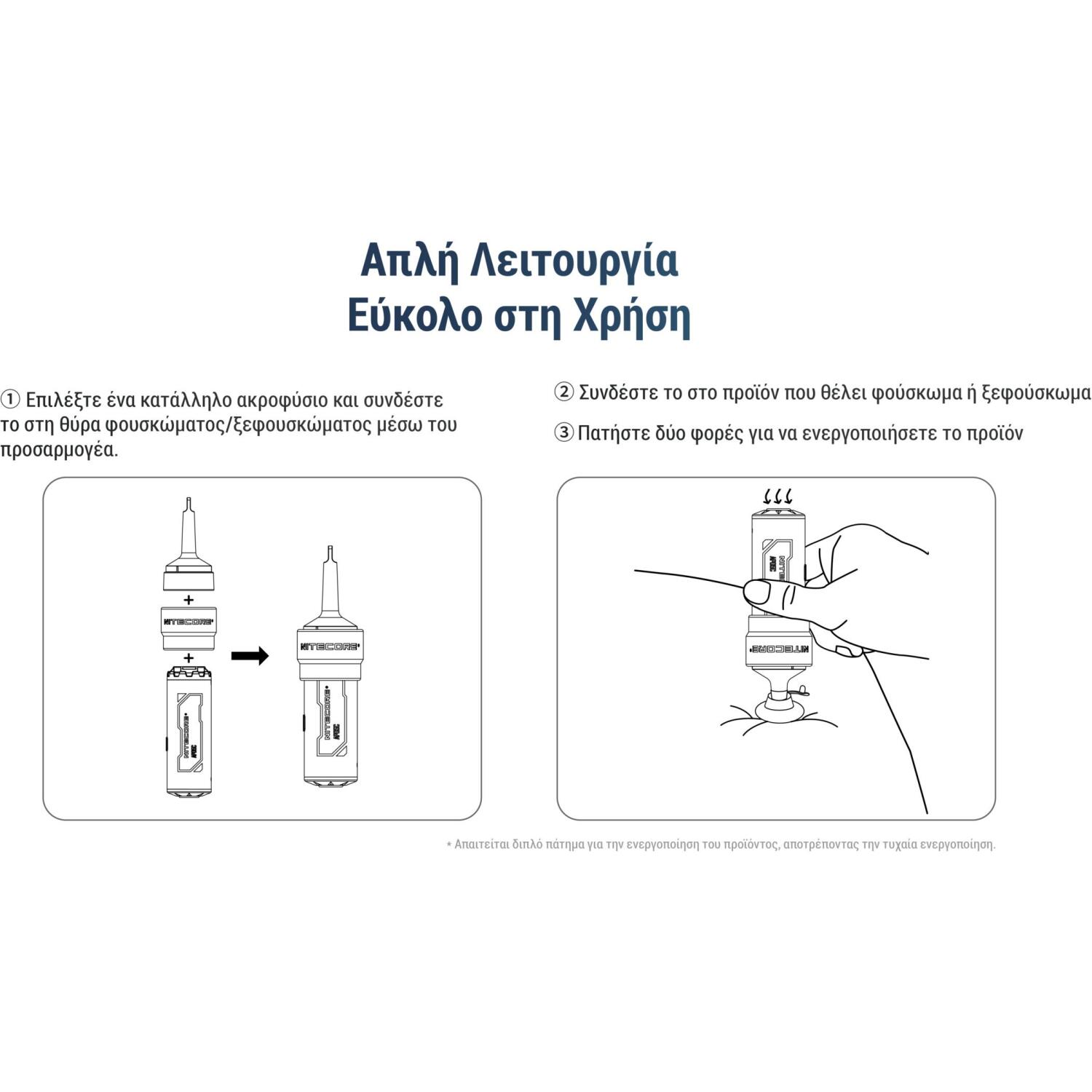 Συνοδεύεται από μία πρακτική θήκη αποθήκευσης, που διατηρεί το AP05C και τα 4 ακροφύσια οργανωμένα, ώστε να έχετε πάντα εύκολη πρόσβαση και ασφαλή αποθήκευση. Με απλή και εύκολη λειτουργία, εσείς απλά επιλέξτε το κατάλληλο ακροφύσιο και συνδέστε το στη θύρα φουσκώματος ή ξεφουσκώματος μέσω του προσαρμογέα. Στη συνέχεια, συνδέστε το στο προϊόν που θέλετε να φουσκώσετε ή να ξεφουσκώσετε και πατήστε δύο φορές για να ξεκινήσει η λειτουργία.