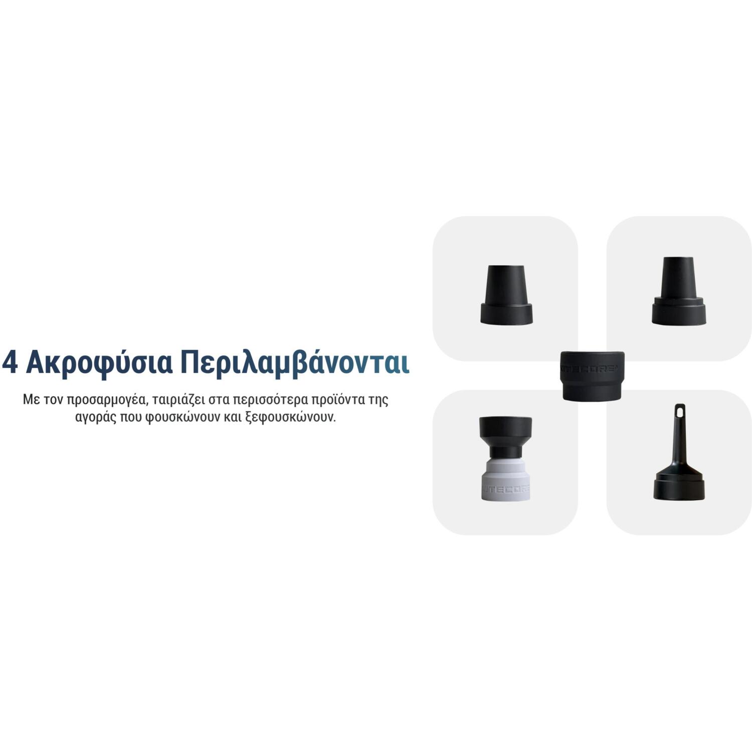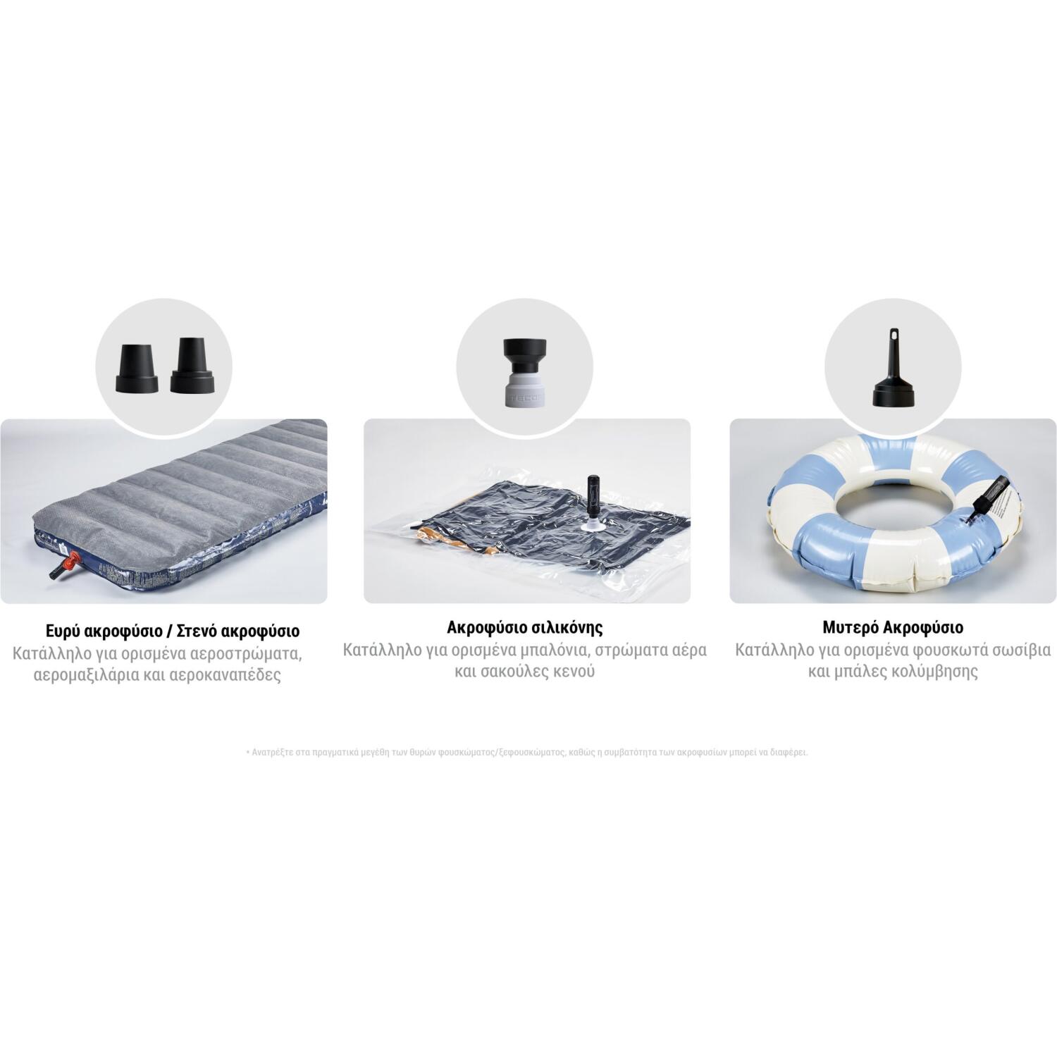 Το σετ περιλαμβάνει 4 διαφορετικά ακροφύσια που, με τον προσαρμογέα, ταιριάζουν στα περισσότερα προϊόντα της αγοράς που φουσκώνουν και ξεφουσκώνουν. Το ευρύ και στενό ακροφύσιο είναι ιδανικό για ορισμένα αεροστρώματα, αερομαξιλάρια και αεροκαναπέδες. Το ακροφύσιο σιλικόνης, είναι κατάλληλο για ορισμένα μπαλόνια, στρώματα αέρα και σακούλες κενού. Το μυτερό ακροφύσιο, ταιριάζει σε ορισμένα φουσκωτά σωσίβια και μπάλες κολύμβησης.
