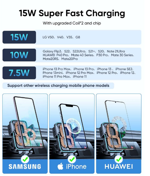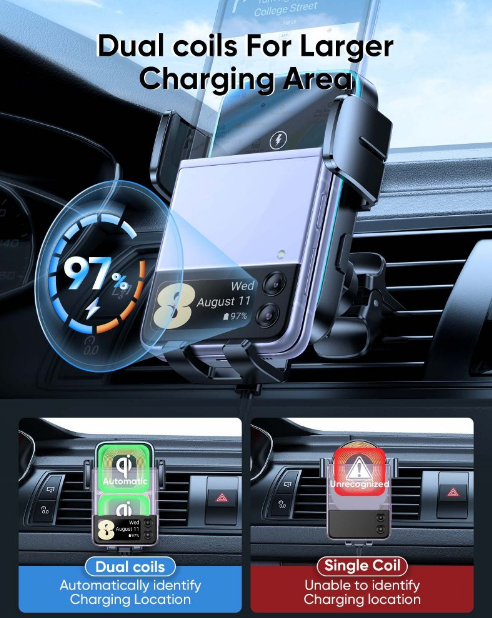 Eίναι μια πρακτική λύση που επιτρέπει την ασύρματη φόρτιση του smartphone σας, καθώς και τη γρήγορη και ασφαλή στήριξη της συσκευής σας, με δυνατότητα τοποθέτησης και αφαίρεσης με το ένα χέρι. Η βάση μπορεί να τοποθετηθεί στους αεραγωγούς του αυτοκινήτου σας και σας προσφέρει την δυνατότητα κάθετης και οριζόντιας θέασης.