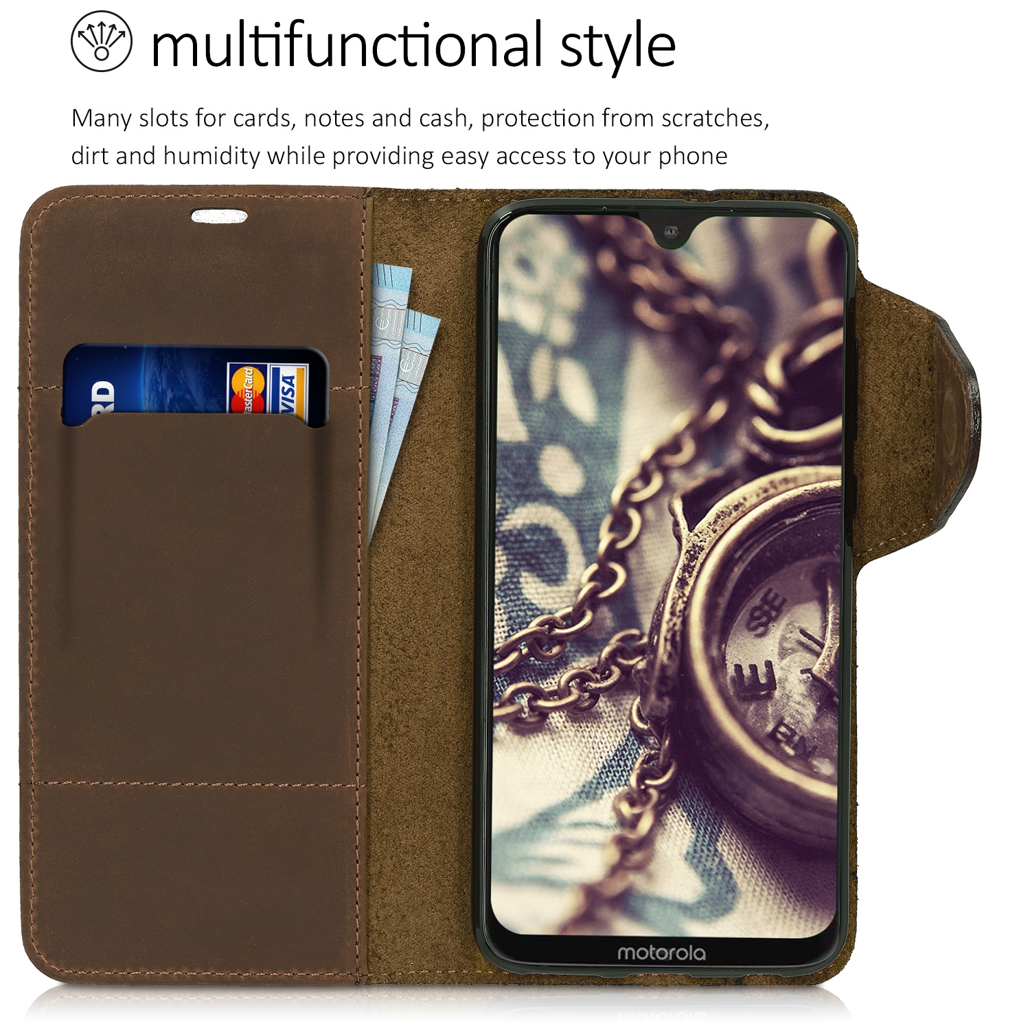 Το πορτοφόλι είναι ειδικά σχεδιασμένο για το Motorola Moto G7 / Moto G7 Plus και διαθέτει 1 θήκη για πιστωτικές κάρτες και μια εσωτερική θήκη για χαρτονομίσματα. Με μαγνητικό κλιπ για ευκολότερη χρήση. Προστατεύει αποτελεσματικά από σκόνες, γρατζουνιές και χτυπήματα, ενώ επιτρέπει την πρόσβαση σε όλες τις λειτουργίες της συσκευής σας.