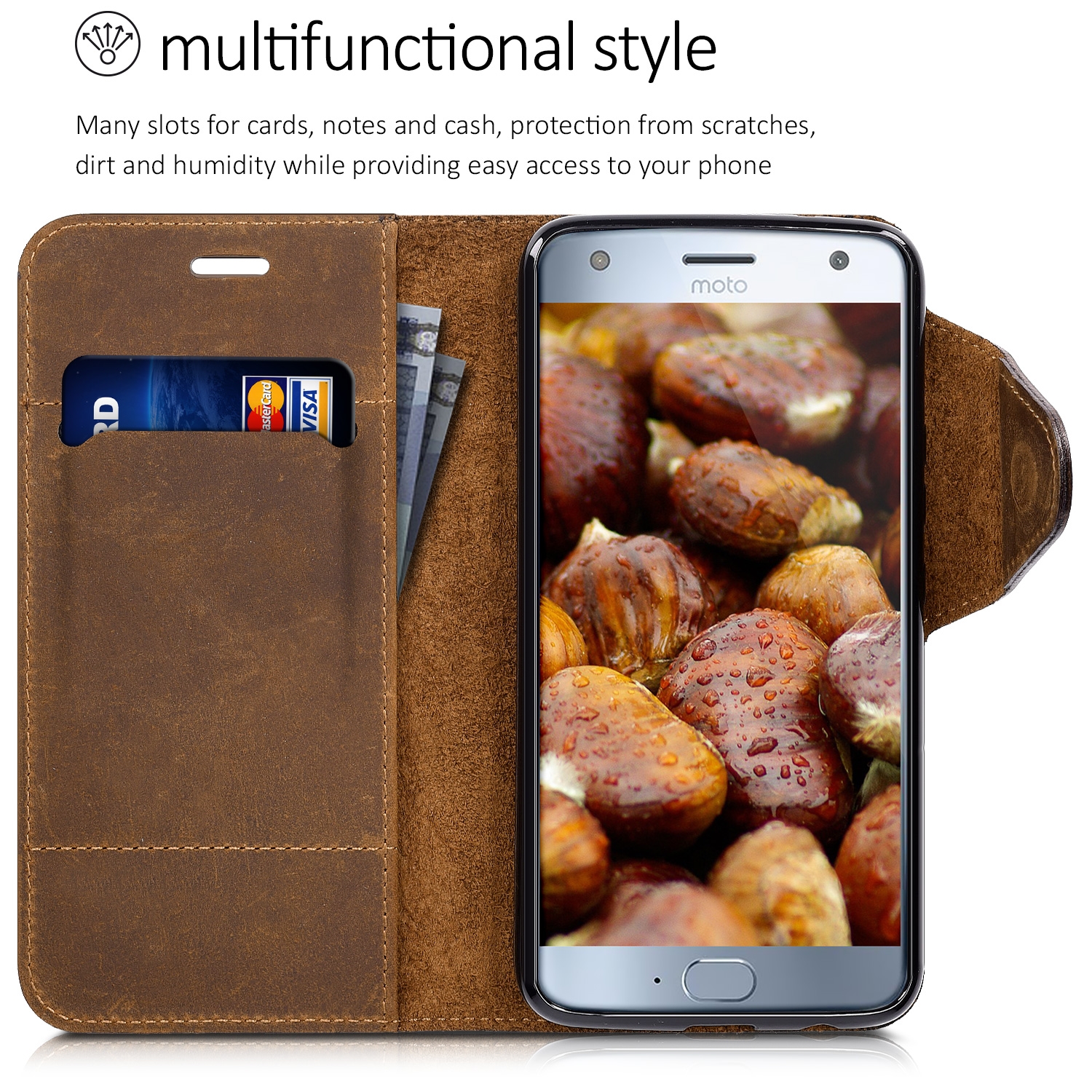 Η θήκη είναι ειδικά σχεδιασμένη για το Motorola Moto X4 , και διαθέτει 1 θήκη για πιστωτικές κάρτες και μια εσωτερική θήκη για χαρτονομίσματα . Με μαγνητικό κλιπ για ευκολότερη χρήση. Προστατεύει αποτελεσματικά από σκόνες, γρατζουνιές και χτυπήματα, ενώ επιτρέπει την πρόσβαση σε όλες τις λειτουργίες της συσκευής σας.