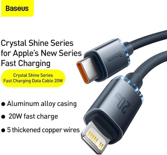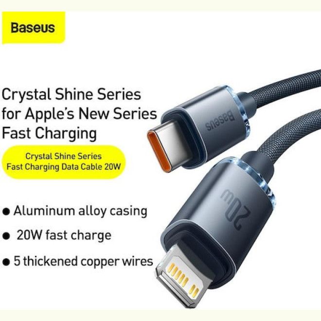 Το καλώδιο Crystal Shine της Baseus είναι εξαιρετικά λειτουργικό και κομψό με εύκολη και βολική χρήση. Είναι επίσης πολύ ανθεκτικό και σας προσφέρει γρήγορη και ασφαλή φόρτιση, χάρη στον εξελιγμένο πυρήνα που διαθέτει, τις γαλβανισμένες ενισχύσεις και τα πέντε σύρματα με ισχύ 20W.