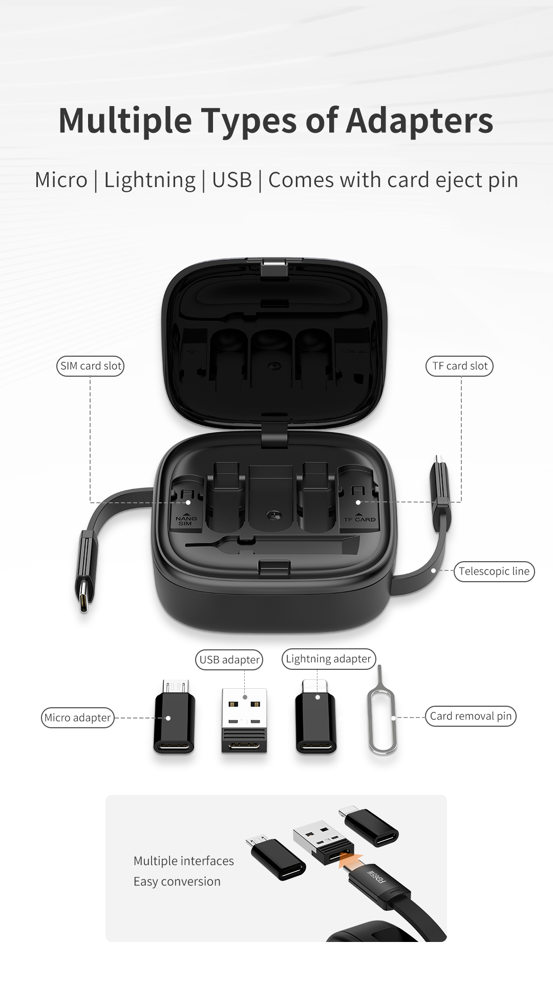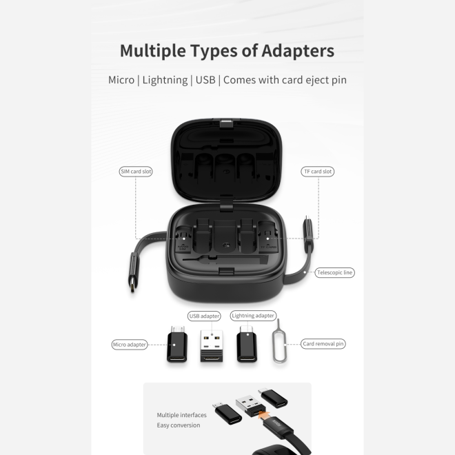 Είναι ελαφρύ και ιδανικό για να το μεταφέρετε παντού μαζί σας, στα ταξίδια, δουλειά ή στην καθημερινότητά σας! Περιλαμβάνονται αντάπτορες για μετατροπή του καλωδίου σε USB-A, Lightning και MicroUSB, υποδοχές για μία Nano Sim και μία κάρτα TF και ένα εργαλείο εξαγωγής SIM!