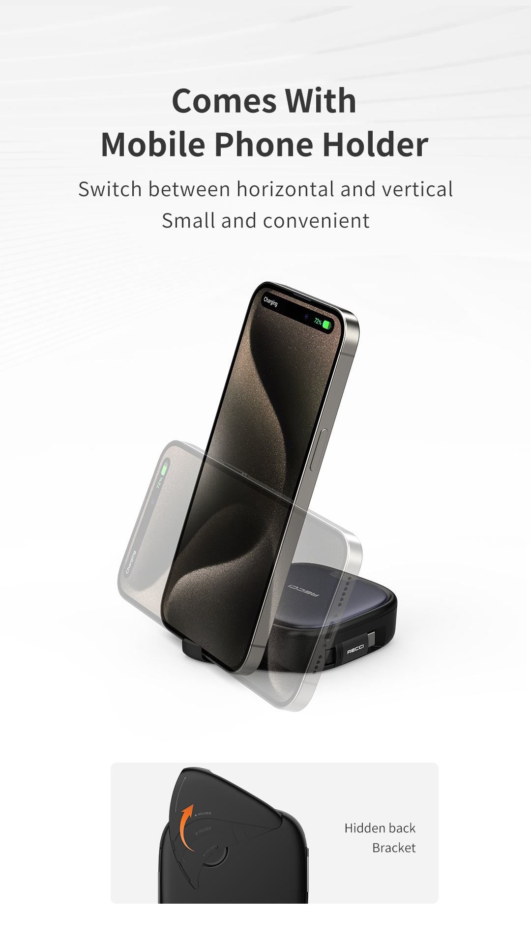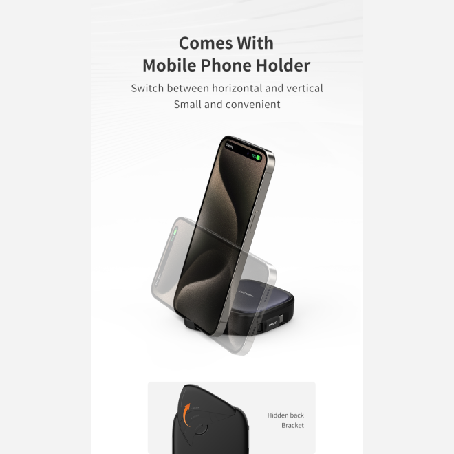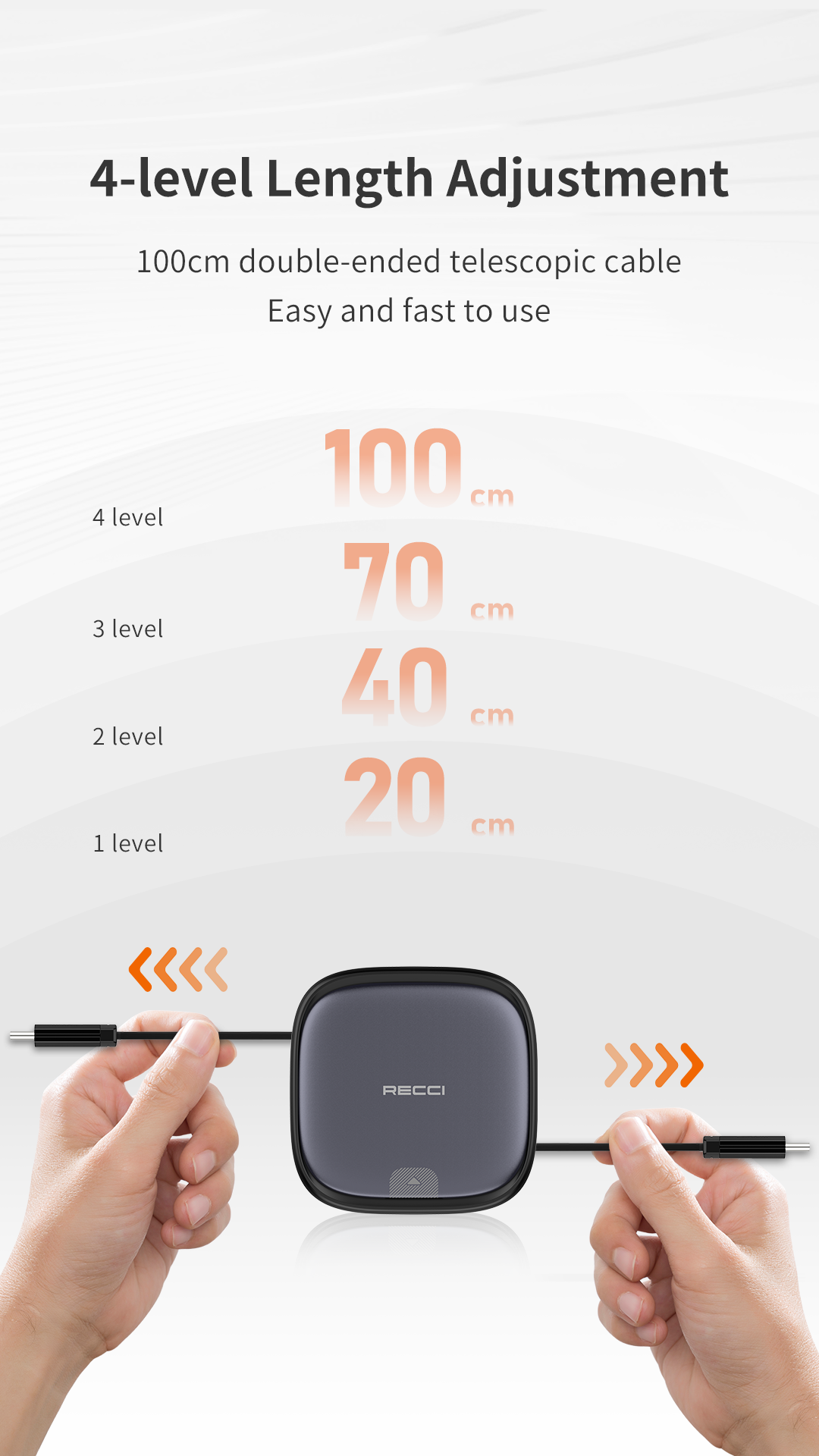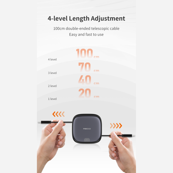 Χάρη στο διπλό πτυσσόμενο καλώδιο μήκους έως 100 cm, μπορείτε να προσαρμόσετε το μήκος σε 4 επίπεδα 20, 40, 70 και 100 cm ανάλογα με τις ανάγκες σας. Διαθέτει εξόδους Type-C / Lightning / USB-A / MicroUSB, ώστε να καλύψει όλες τις συσκευές σας, παλιές και καινούργιες. Επιπλέον, διαθέτει μία ενσωματωμένη βάση, η οποία σας επιτρέπει να τοποθετείτε το κινητό σας οριζόντια ή κάθετα.