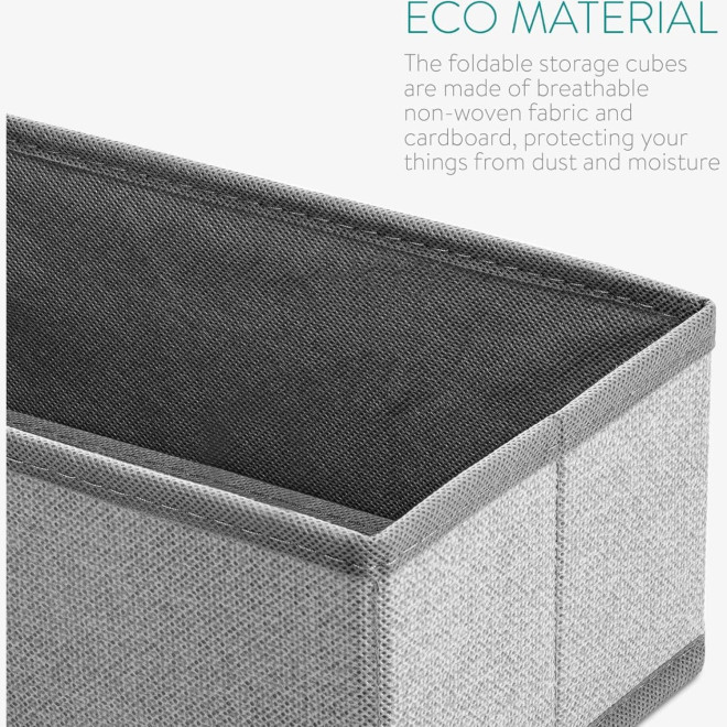 Αυτά τα κουτιά οργάνωσης προσαρμόζονται εύκολα σε κάθε σας ανάγκη, προσφέροντάς σας άφθονο χώρο για όλα σας τα προσωπικά αντικείμενα. Είναι κατασκευασμένα από ανθεκτικό και ανεπνέυσιμο, οικολογικό υλικό, το οποίο αποτελείται από μη υφασμένο ύφασμα και χαρτόνι, έτσι είναι ελαφροί και προστατεύουν τα πράγματά σας από σκόνη και υγρασία. Ο κομψός τους, μίνιμαλ σχεδιασμός, ταιριάζει με κάθε χώρο και δωμάτιο, μπάνιο ή γραφείο.