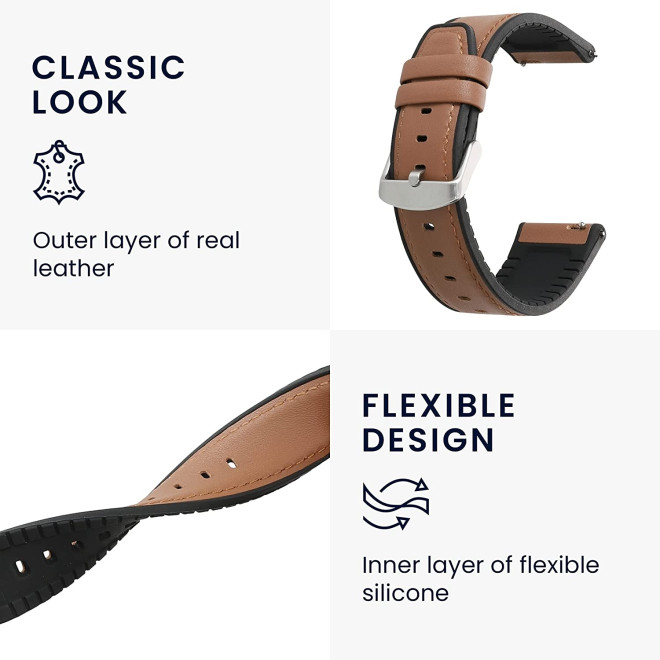 Κατασκευασμένο από premium μαλακή σιλικόνη εσωτερικά και γνήσιο δέρμα εξωτερικά, συμβατό με το αγαπημένο σας Huawei Watch GT 3 42mm / Watch GT 2 42mm / Watch 2. Ανθεκτικό στη χρήση, με στιβαρό και μακράς διαρκείας σχεδιασμό, που αντέχει στην χρήση.