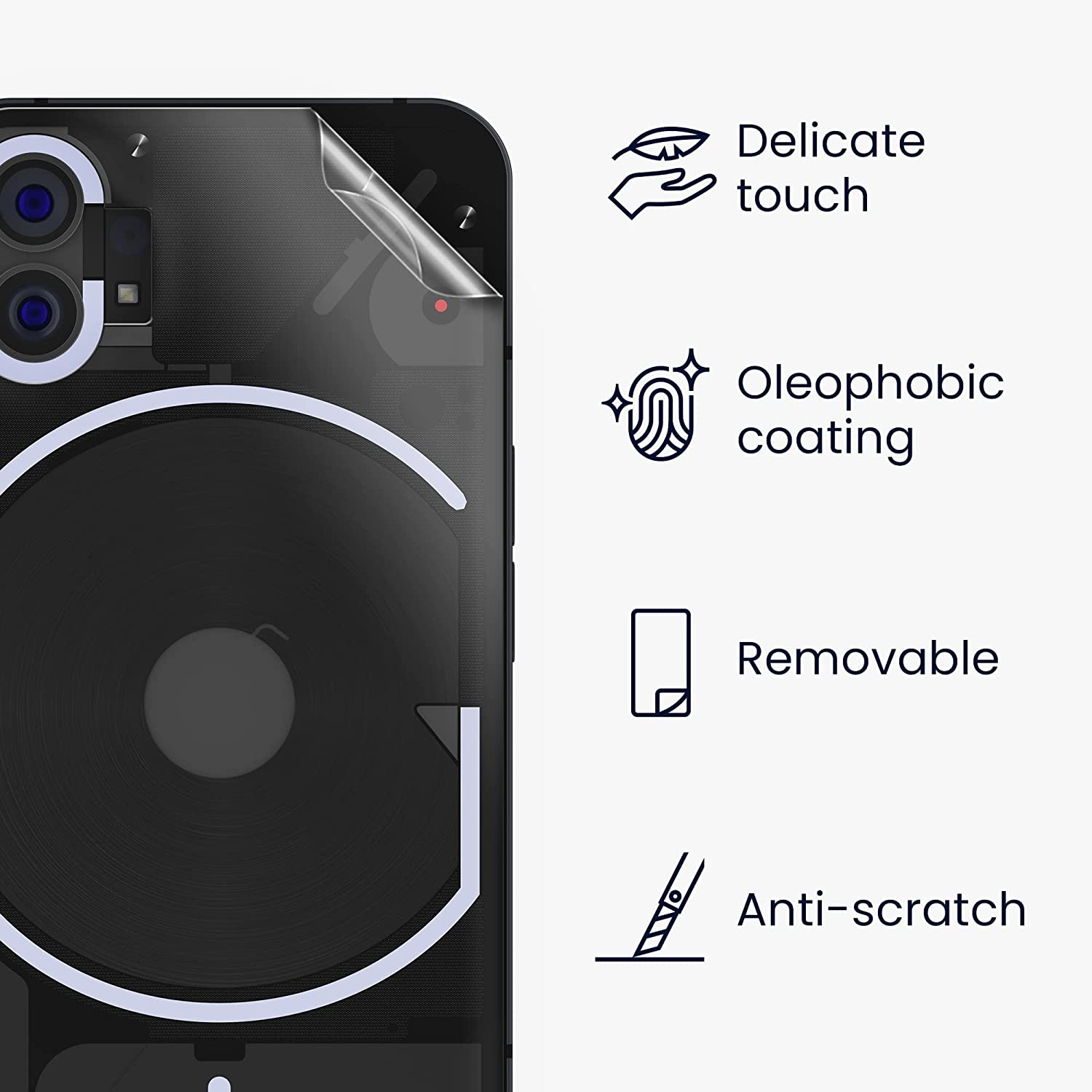 Κολλάει ομαλά χωρίς να δημιουργούνται ενοχλητικές φυσαλίδες αέρα, είναι ανθεκτική στις γρατσουνιές, πλένεται, είναι εξαιρετικά διαφανής. Αυτή η μοναδική προστατευτική μεμβράνη, θα διατηρήσει την πλάτη του Nothing Phone 1 στην αρχική του κατάσταση.