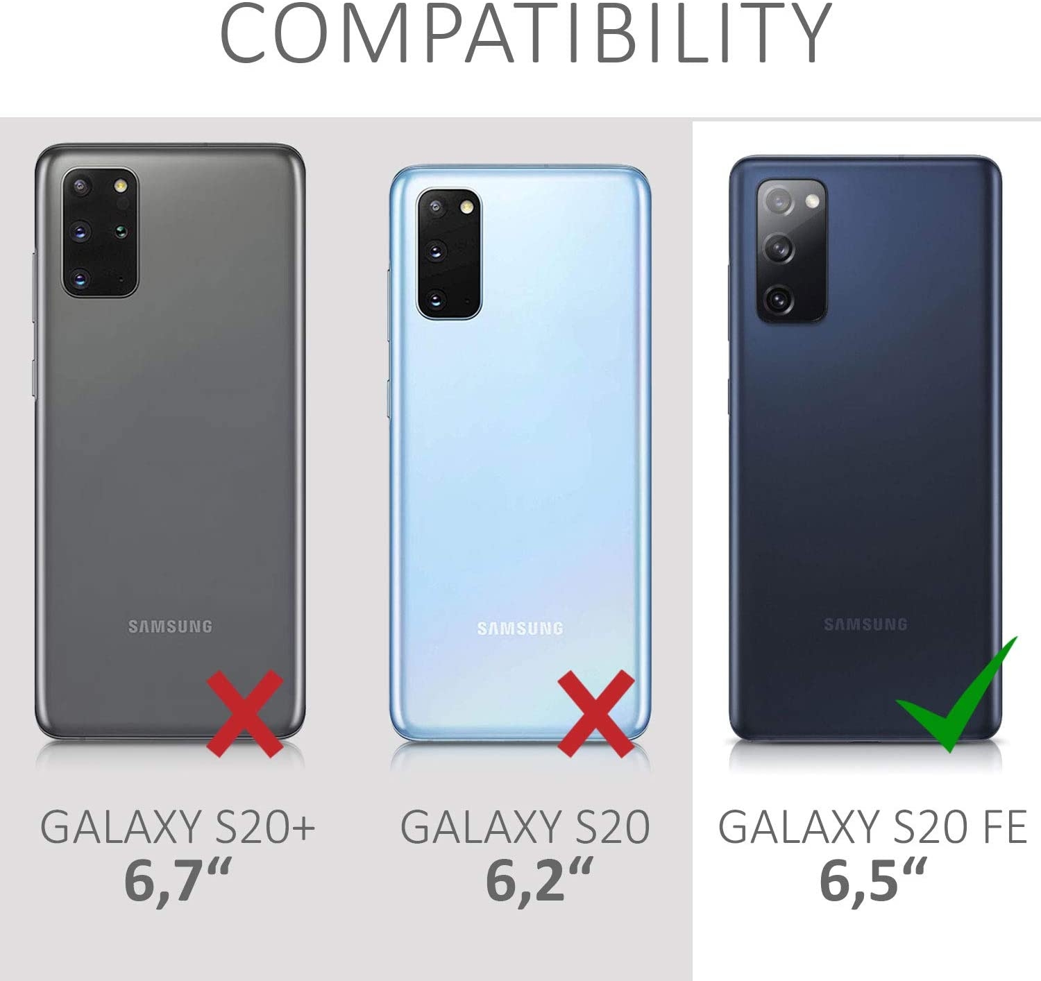 Η θήκη είναι συμβατή μόνο με το Samsung Galaxy S20 FE και όχι με το Samsung Galaxy S20 ή S20 Plus ή S20 Ultra.