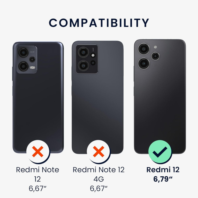 Η θήκη είναι συμβατή μόνο με το Xiaomi Redmi 12 και όχι με το Xiaomi Redmi Note 12, Redmi Note 12 Pro, Redmi 12C, Redmi Note 12 Pro Plus, Redmi Note 12 4G, Redmi Note 12S, Redmi Note 12 Pro 4G, Redmi Note 12R, Redmi Note 12 Turbo, Redmi Note 12R Pro, Redmi Note 12T Pro, Redmi Note 12 (China), Redmi Note 12 Pro Speed, Redmi Note 12 Discovery.
