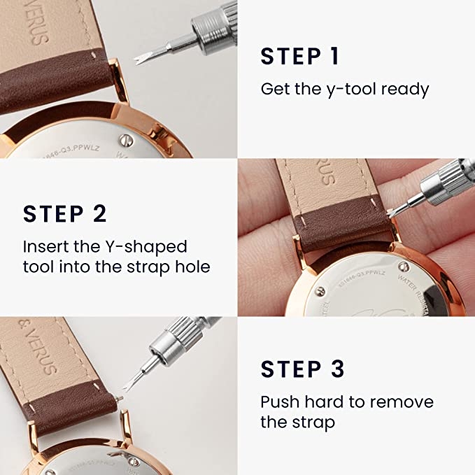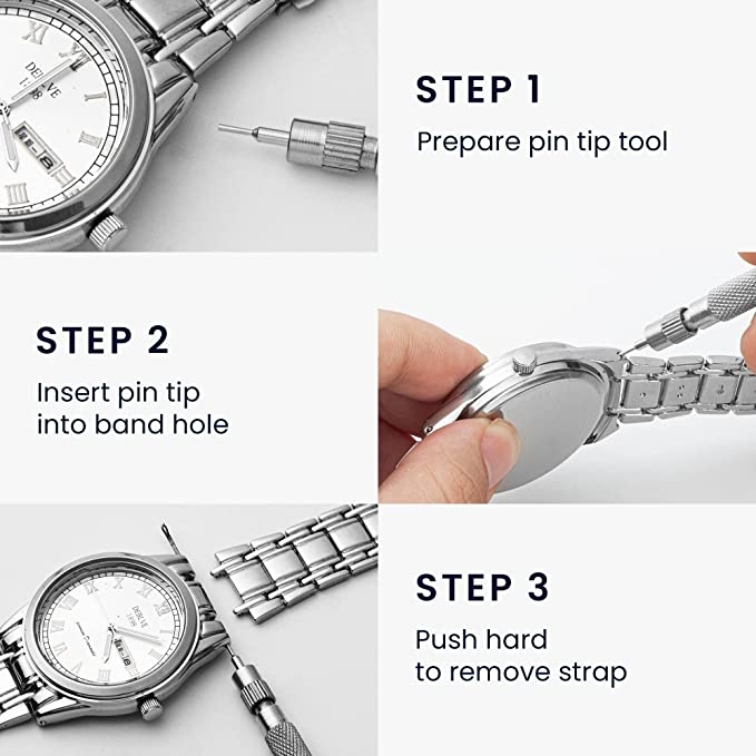 Διαθέτει ισχυρή και ανθεκτική κατασκευή από ανοξείδωτο ατσάλι, επομένως είναι ανθεκτικό και στην καθημερινή χρήση. Επίσης σας προσφέρει πολύ εύκολη χρήση, εσείς απλά τοποθετήστε την κεφαλή που θέλετε στο εργαλείο, εισάγετε την κεφαλή στον πείρο του ρολογιού και πιέστε δυνατά για να αφαιρέσετε το λουράκι.