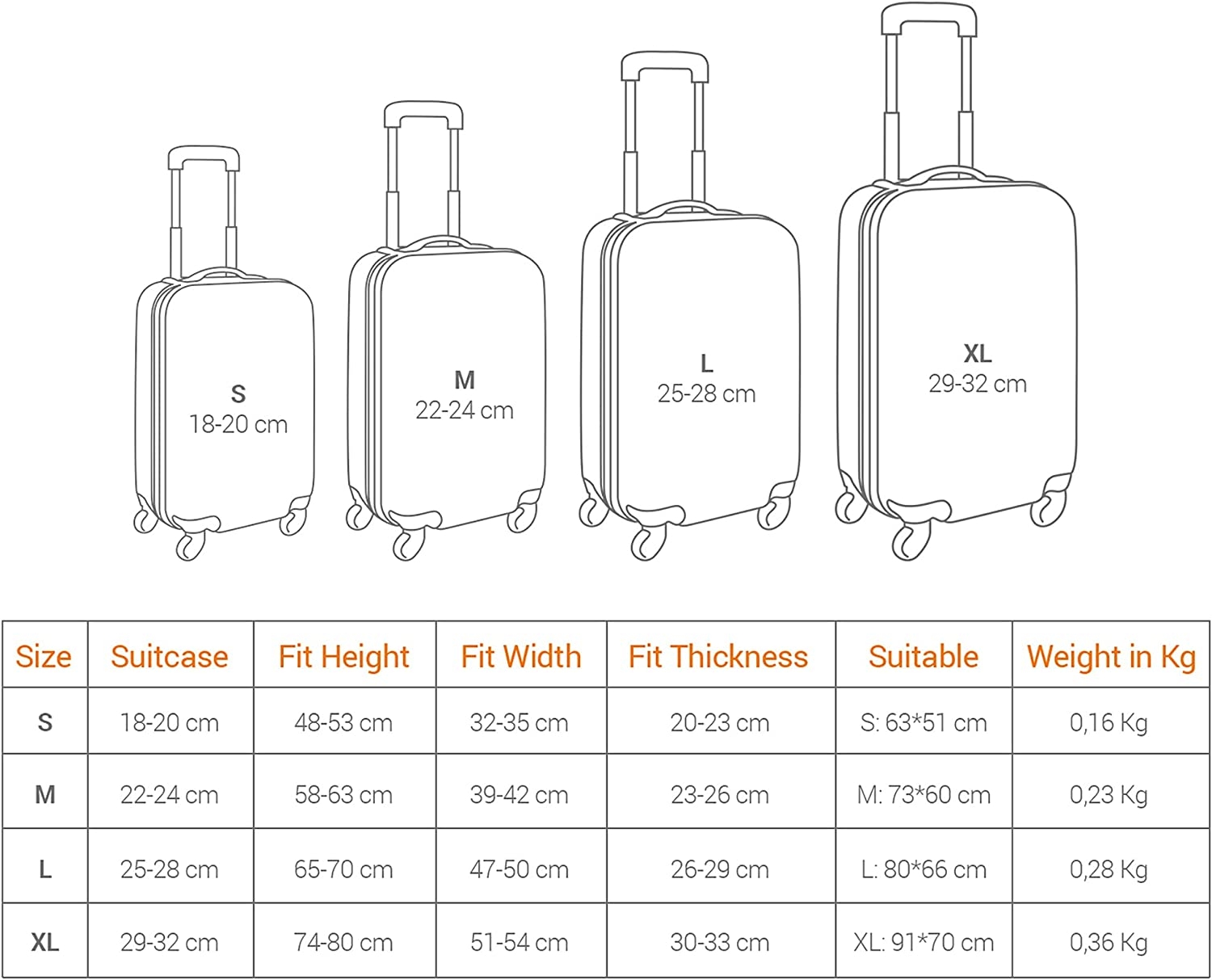 Είναι κατάλληλο για μέγεθος βαλίτσας 74-80 x 51-54 x 30-33 cm και διαθέτει όλες τις απαραίτητες εγκοπές για την απρόσκοπτη λειτουργία της αποσκευής σας, έτσι η επεκτεινόμενη λαβή αλλά και η λαβή στο πλάι δεν καλύπτονται.
