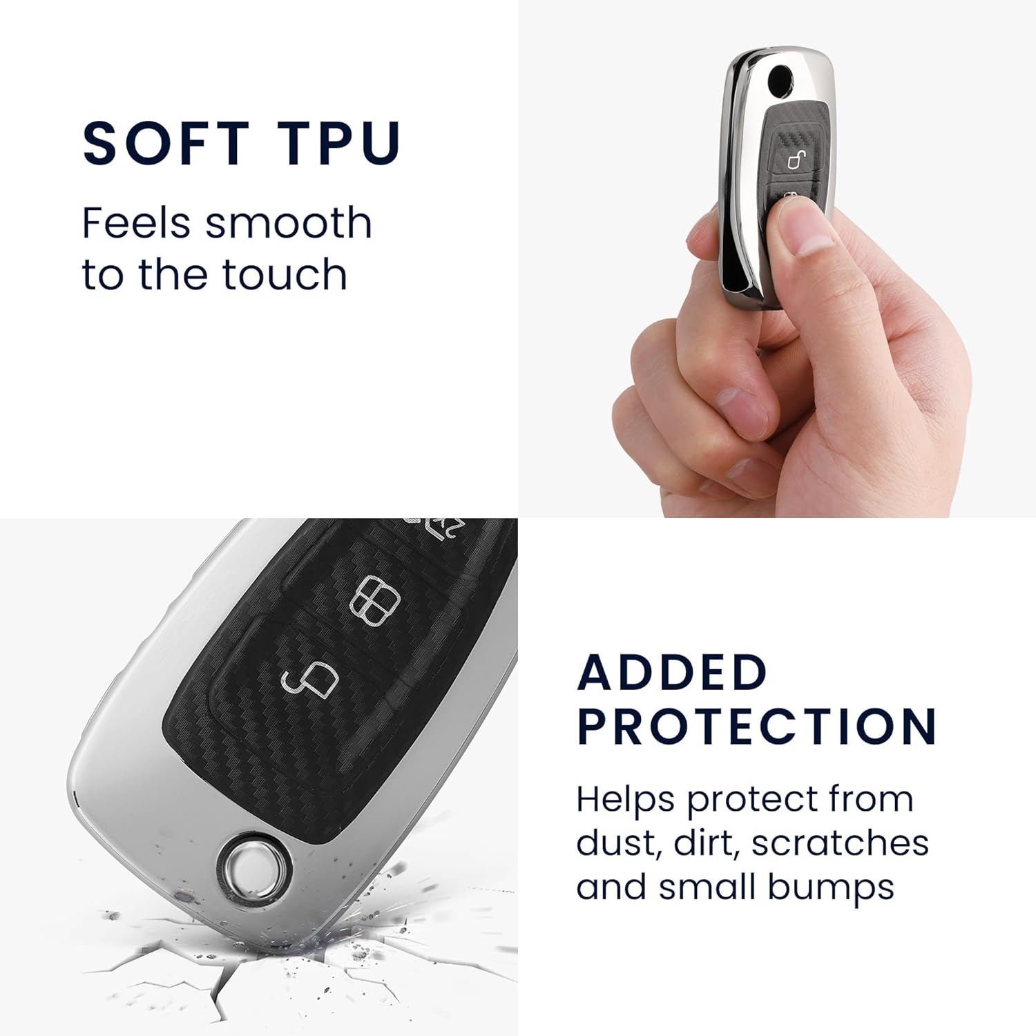 Το υλικό TPU υψηλής ποιότητας προσφέρει άνετη εφαρμογή και απαλή αίσθηση στην αφή, ενώ το σχέδιο από άνθρακα γύρω από τα κουμπιά και οι ρίγες στο πίσω μέρος προσθέτουν στυλ και επιπλέον προστασία. Ειδικά σχεδιασμένη για να ταιριάζει απόλυτα στο μοντέλο του κλειδιού του αυτοκινήτου σας, αυτή η θήκη τοποθετείται εύκολα χωρίς εργαλεία, προσφέροντας προστασία χωρίς παρεμβολές.