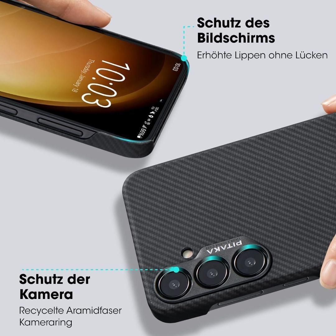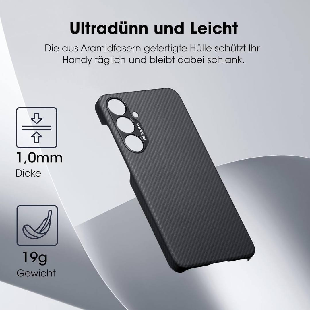 Η θήκη είναι κατασκευασμένη με χρήση ινών αραμιδίου αεροδιαστημικής ποιότητας, η οποία είναι 5 φορές ισχυρότερη από το ατσάλι αλλά είναι περίπου 5 φορές ελαφρύτερη. Προσφέρει μινιμαλιστικό στυλ, ώστε να απολαύσετε τον αυθεντικό σχεδιασμό του Samsung Galaxy S24 Plus και να εκτιμήσετε την ομορφιά του όσο το δυνατόν περισσότερο. Η κοπή λοξοτομής κάνει τη θήκη να φαίνεται πιο λεπτή και πιο άνετη στο κράτημα.