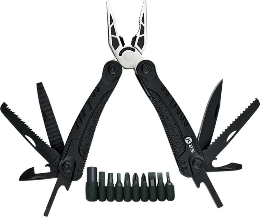 Κατασκευασμένο από υψηλής ποιότητας ανοξείδωτο ατσάλι, εξασφαλίζει την μακροχρόνια αντοχή και ανθεκτικότητα στη φθορά. Η στιβαρή του κατασκευή το καθιστά ιδανικό για απαιτητικές συνθήκες εργασίας, ενώ παράλληλα διατηρεί την κομψότητά του. Διαθέτει μια ευρεία γκάμα λειτουργιών, καθιστώντας το απαραίτητο για κάθε εργασία. Περιλαμβάνει πένσες, κόφτες καλωδίων, μαχαίρι, κατσαβίδια, ανοιχτήρι μπουκαλιών και κονσέρβας, πριόνι και άλλα.