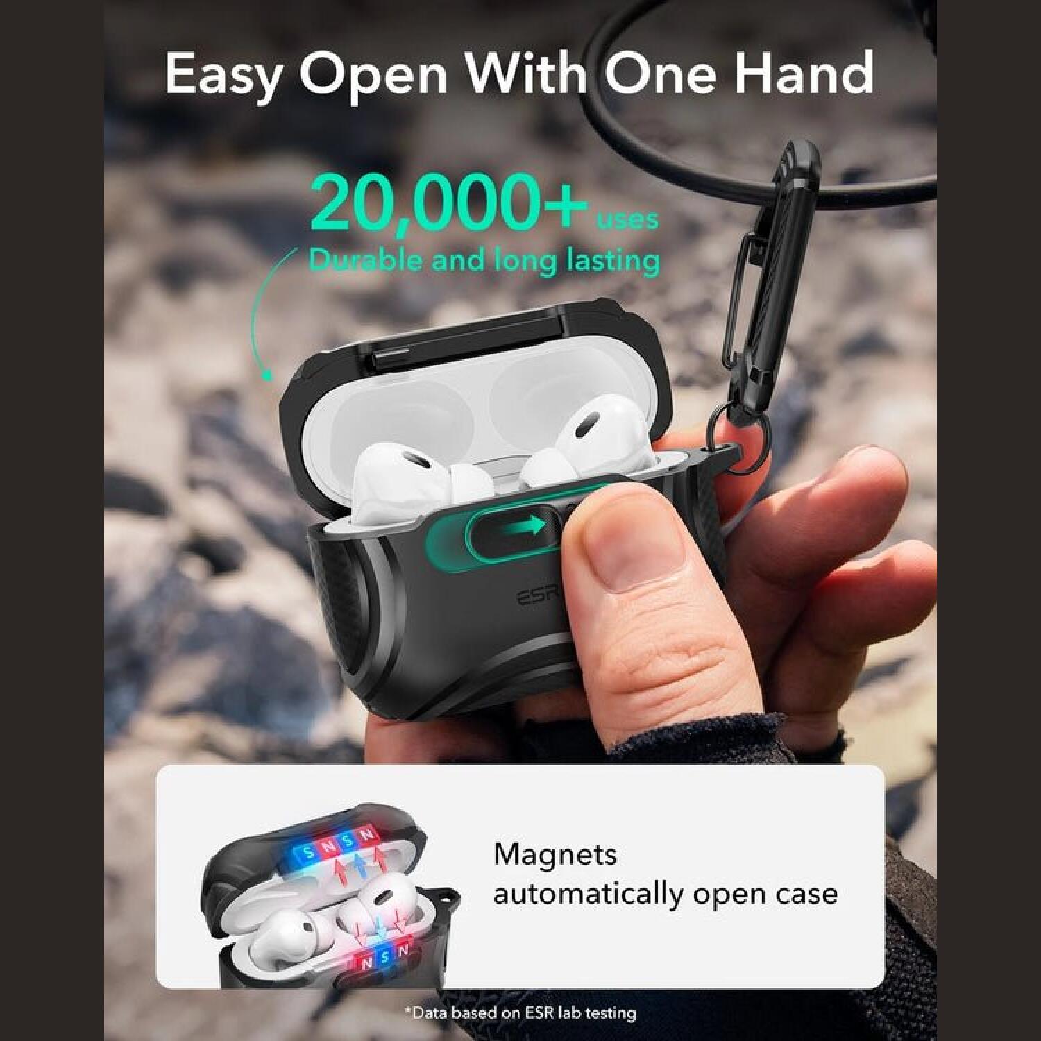 Με μια απλή κίνηση, σύροντας το ρυθμιστικό στο μπροστινό μέρος, το κούμπωμα απελευθερώνεται και το καπάκι ανοίγει, έτσι, έχετε άμεση πρόσβαση στα ακουστικά σας, ακόμη και με το ένα χέρι. Τέλος, περιλαμβάνεται και ένα πρακτικό καραμπίνερ - κλιπ, το οποίο μπορείτε να το τοποθετήσετε στην τσάντα ή τη ζώνη σας, ώστε τα AirPods Pro 3rd Gen να παραμένουν ασφαλή όταν βρίσκεστε εν κινήσει.