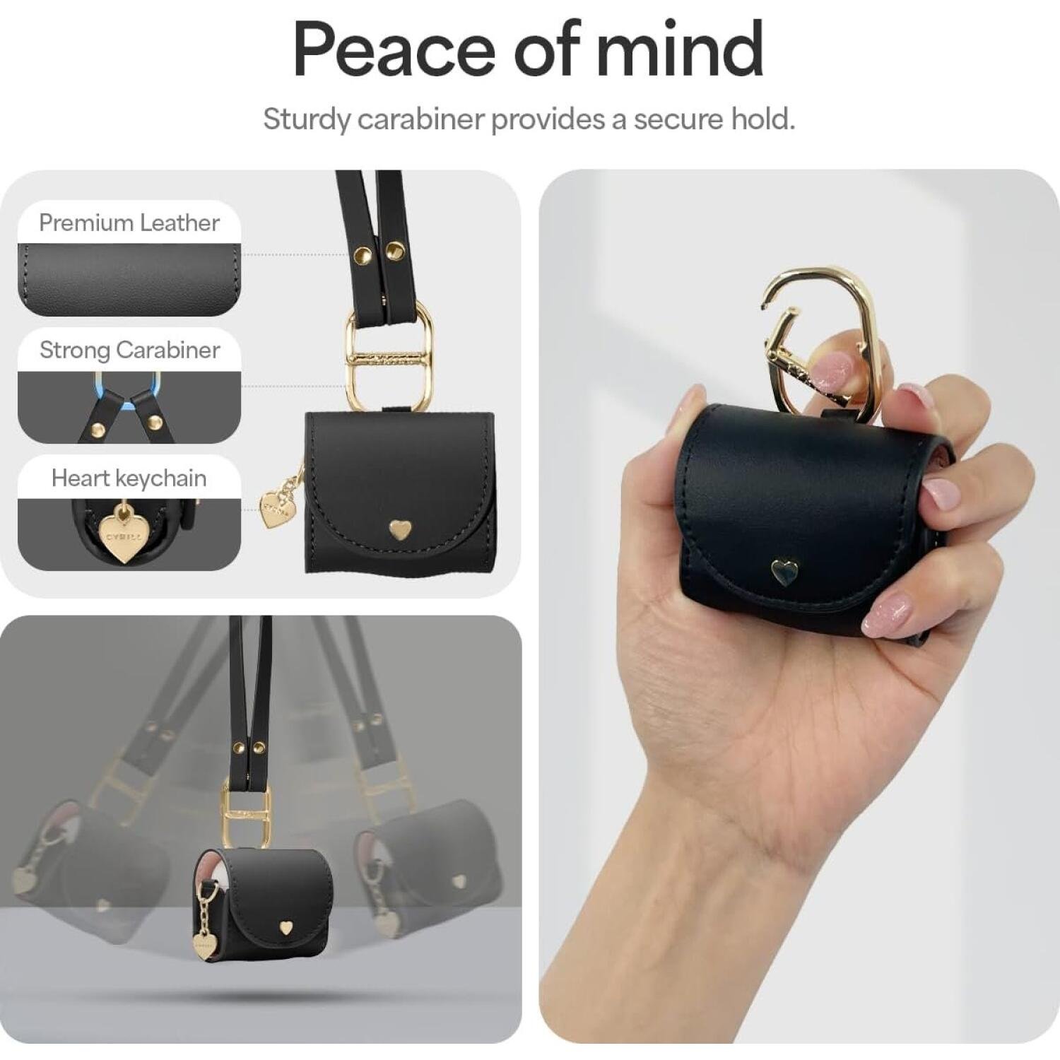 Η θήκη συνοδεύεται από ένα υπέροχο μπρελόκ καραμπίνερ, για την μεταφορά και ασφάλεια των αγαπημένων σας ακουστικών αλλά και την προστασία τους από πτώσεις, κλοπές και λανθασμένες τοποθετήσεις. Επίσης, διαθέτει ένα ασορτί λουράκι χιαστί, με λεπτομέρειες σε σχήμα καρδιάς που της δίνουν μία όμορφη εμφάνιση, ενώ η εσωτερική ροζ επένδυση και οι κομψές ραφές στις άκρες προσθέτουν μια πολυτελή αίσθηση.