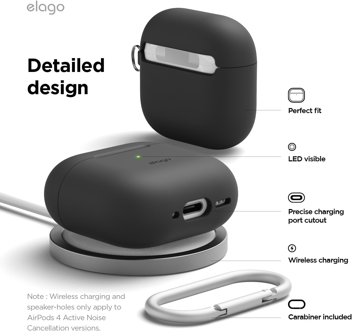 Σημείωση: Τα AirPods 4th Gen δεν περιλαμβάνονται. Μόνο τα AirPods 4th Gen Active Noise Cancellation είναι συμβατά με την ασύρματη φόρτιση και όχι τα AirPods 4th Gen. Η θήκη έχει εγκοπές συμβατές με τα ηχεία των AirPods 4th Gen Active Noise Cancellation.