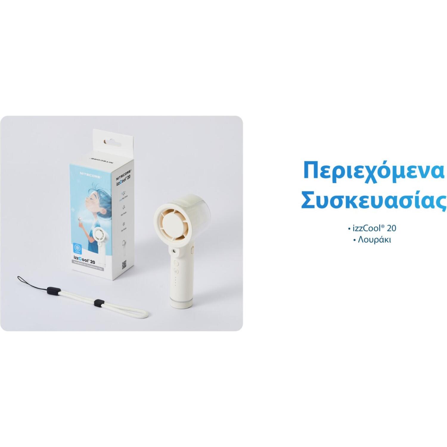Η συσκευασία περιλαμβάνει: 1 x Ανεμιστήρας Nitecore izzCool 20, 1 x Λουράκι Χειρός.