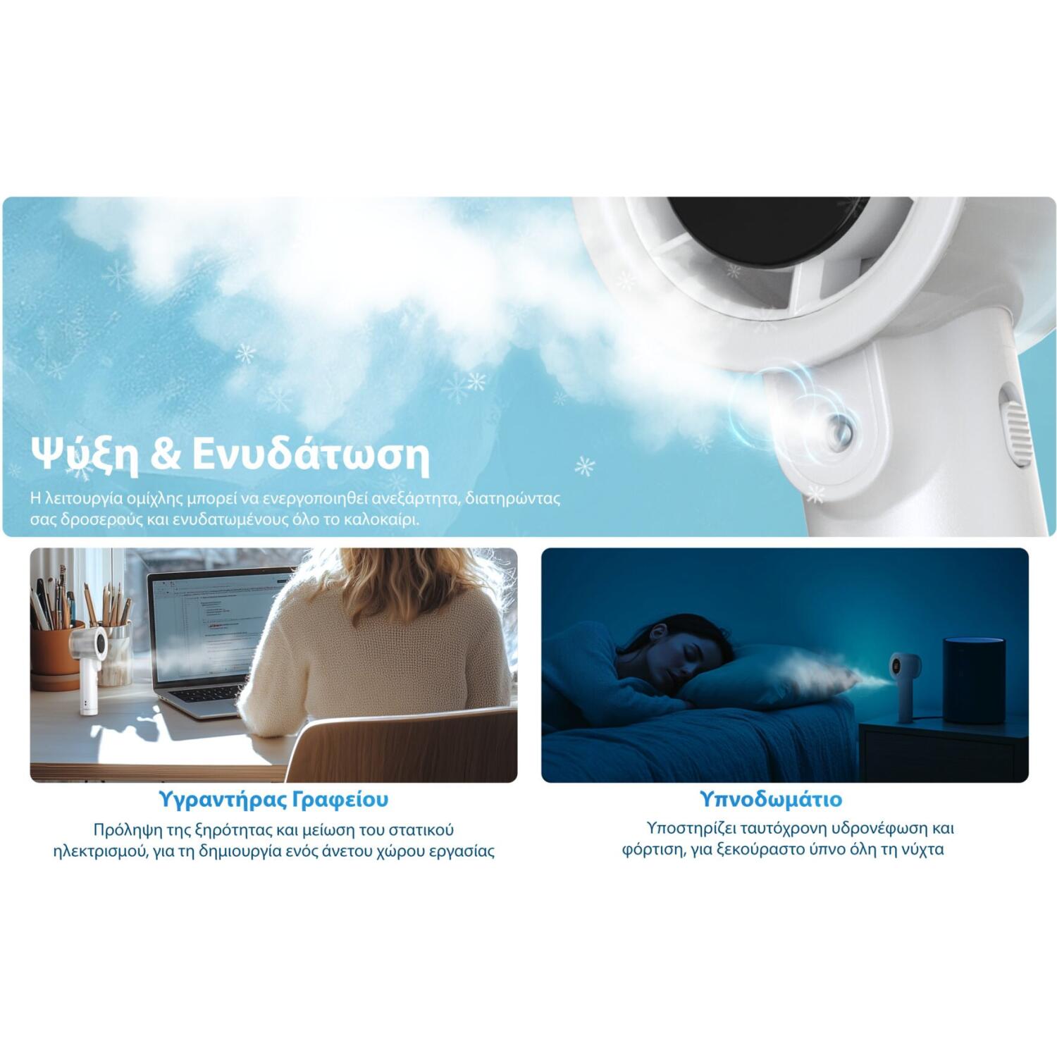 Η λειτουργία ομίχλης, ψύχει και ενυδατώνει, ενώ μπορείτε να απολαύσετε μέγιστη διάρκεια λειτουργίας έως και 44 ώρες, ταυτόχρονα, σας προσφέρει γρήγορη φόρτιση μέσω της θύρα Type-C, καθώς μπορεί να φορτιστεί πλήρως σε μόλις 1 ώρα και 50 λεπτά με γρήγορη φόρτιση. Επίσης, έχει έναν premium σχεδιασμό με μία διακριτική λάμψη, δίνοντάς σας μία αίσθηση πολυτέλειας.