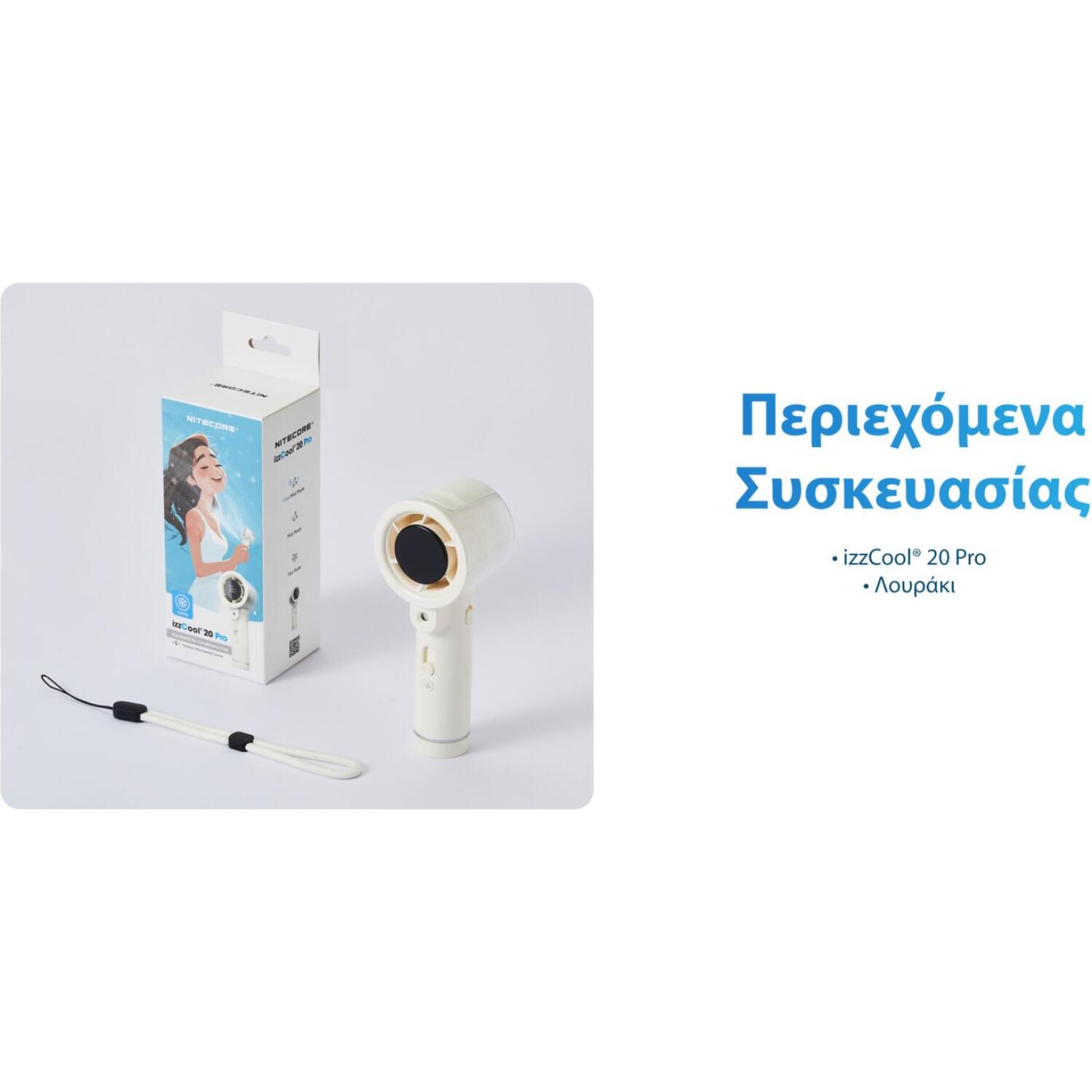 Η συσκευασία περιλαμβάνει: 1 x Ανεμιστήρας Nitecore izzCool 20 Pro, 1 x Λουράκι Χειρός.