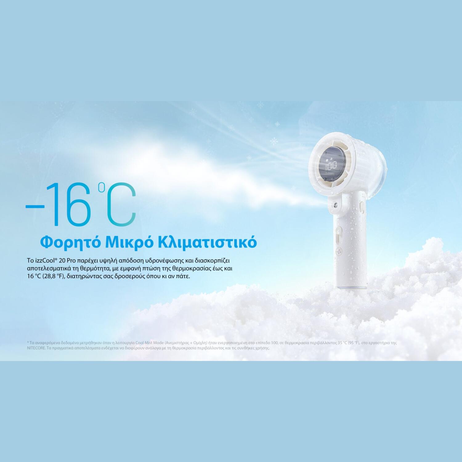 Ο ανεμιστήρας izzCool 20 Pro της Nitecore είναι ένας ατομικός, επιτραπέζιος ανεμιστήρας με υγραντήρα και λουράκι χειρός. Είναι ένα φορητό κλιματιστικό, το οποίο μπορείτε να το μεταφέρετε παντού μαζί σας! Σας προσφέρει υψηλή απόδοση υδρονέφωσης και μπορεί να μειώσει τη θερμοκρασία έως και 16°C, ώστε να παραμένετε πάντα δροσεροί!