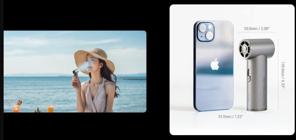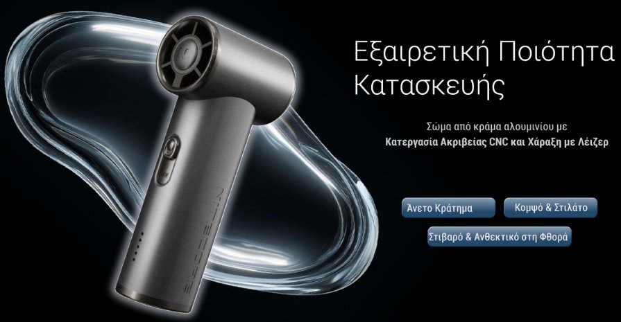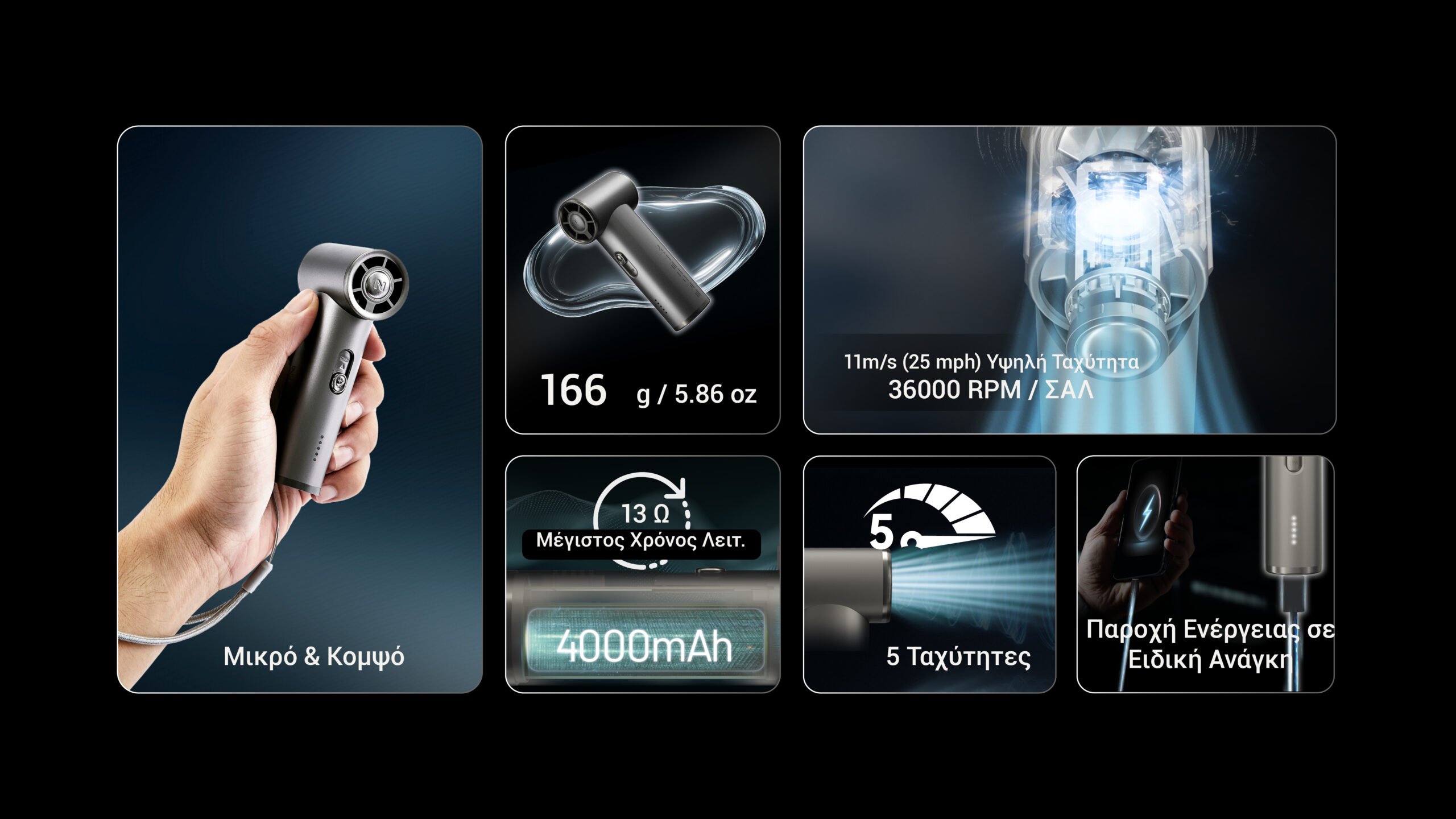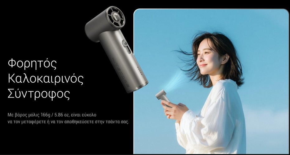 Διαθέτει έναν συμπαγή σχεδιασμό ώστε να μπορείτε να το χρησιμοποιείτε καθημερινά κατά την διάρκεια του καλοκαιριού όπου και αν βρίσκεστε. Είναι μικρό και κομψό, με βάρος μόλις 166 γραμμάρια, διαθέτει ισχυρή μπαταρία χωρητικότητας 4000mAh, προσφέροντας μέγιστο χρόνο λειτουργίας έως και 13 ώρες. Με ταχύτητα περιστροφής 36.000 στροφών ανά λεπτό (rpm) και μέγιστη ταχύτητα αέρα 11 m/s (25 mph), θα σας εντυπωσιάσει με την δροσιά του.