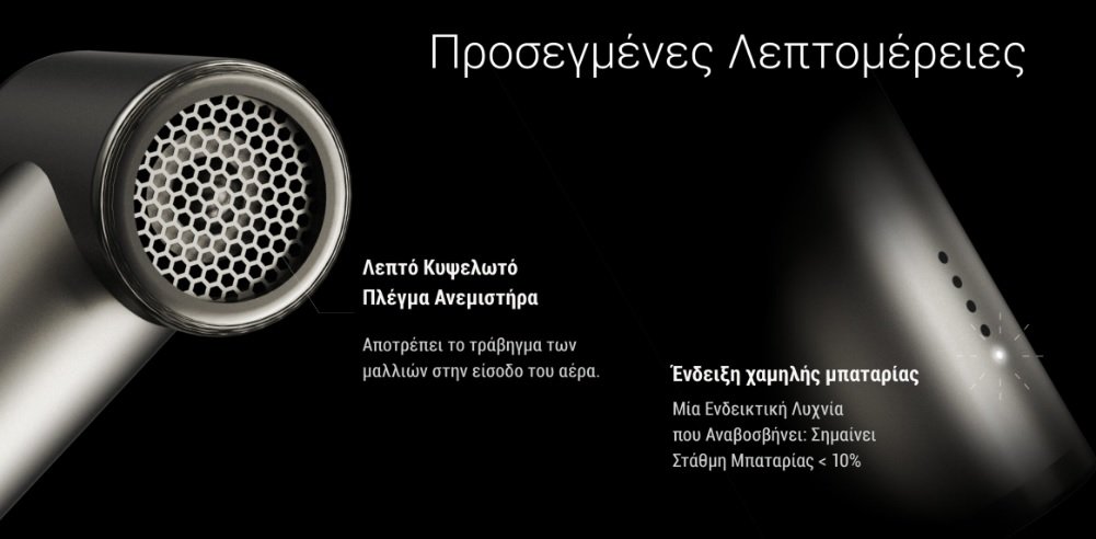Είναι σχεδιασμένο με γνώμονα την λεπτομέρεια, καθώς διαθέτει λεπτό, κυψελωτό πλέγμα, το οποίο αποτρέπει το τράβηγμα των μαλλιών στην είσοδο του αέρα. Διαθέτει ένδειξη χαμηλής μπαταρίας μέσω μιας ενδεικτικής λυχνίας που αναβοσβήνει, υποδεικνύοντας ότι η στάθμη της μπαταρίας έχει φτάσει περίπου στο 10%.