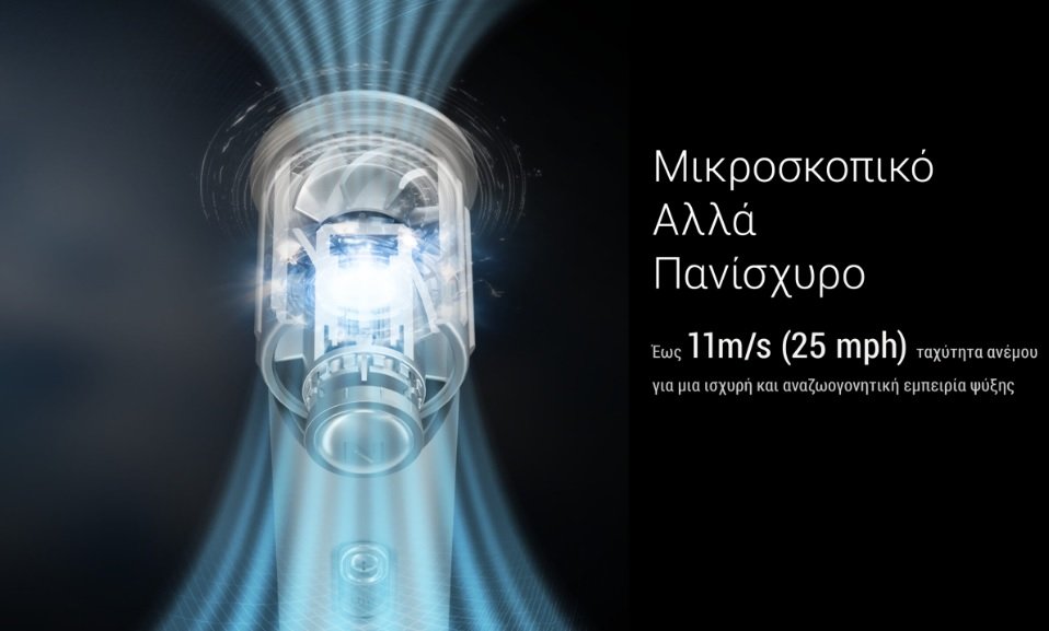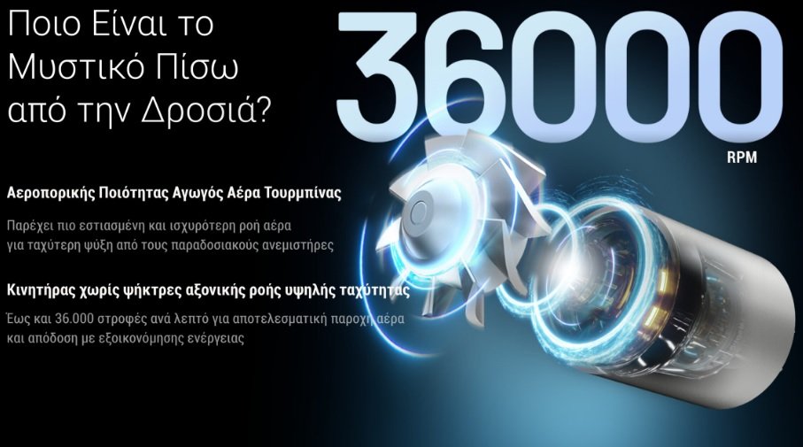 Το μυστικό πίσω από την ισχυρή δροσιά είναι ο κινητήρας υψηλής ταχύτητας χωρίς ψήκτρες με αξονική ροή, που φτάνει έως και 36.000 στροφές ανά λεπτό! Ο αεροπορικής ποιότητας αγωγός αέρα, παρέχει πιο εστιασμένη και ισχυρότερη ροή αέρα, για ταχύτερη και αποδοτικότερη ψύξη σε σύγκριση με τους συμβατικούς ανεμιστήρες, με ταυτόχρονη εξοικονόμηση ενέργειας.