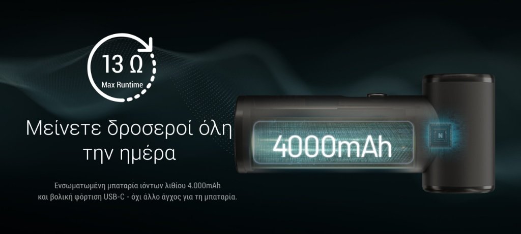 Είναι μικρό σε μέγεθος αλλά πανίσχυρο, καθώς προσφέρει ταχύτητα ανέμου έως 11 m/s (25 mph), για μια ισχυρή και αναζωογονητική εμπειρία δροσιάς. Απολαύστε έως και 13 ώρες δροσιάς όλη την ημέρα καθώς διαθέτει ενσωματωμένη μπαταρία ιόντων λιθίου 4.000mAh για μεγάλη αυτονομία και εύκολη φόρτιση μέσω της θύρας Type-C. Θα γίνει ο φορητός καλοκαιρινός σας σύντροφος, ιδανικός για κάθε σας έξοδο!