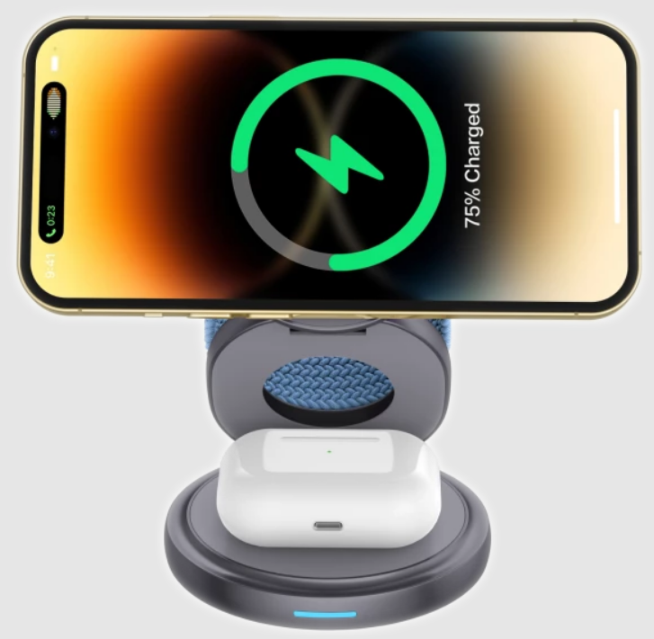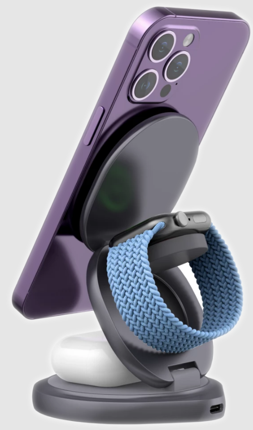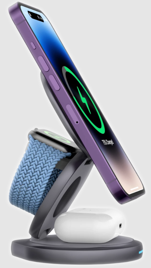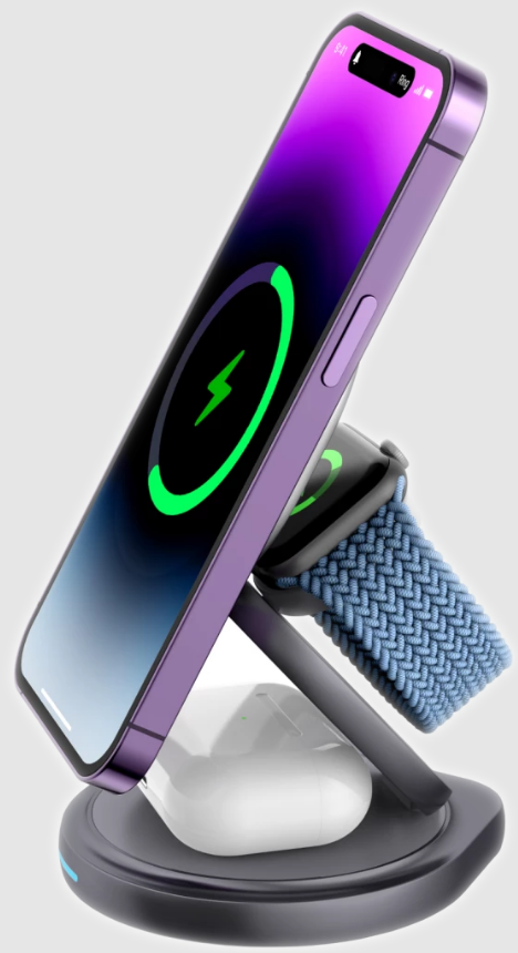 Η μαγνητική αναδιπλούμενη και περιστρεφόμενη βάση ασύρματης φόρτισης MagSafe της Ofkoz σας επιτρέπει να φορτίζετε τρεις συσκευές ταυτόχρονα ή εντελώς ξεχωριστά και είναι κατάλληλο για iPhone με τη λειτουργία MagSafe, AirPods και Apple Watch.