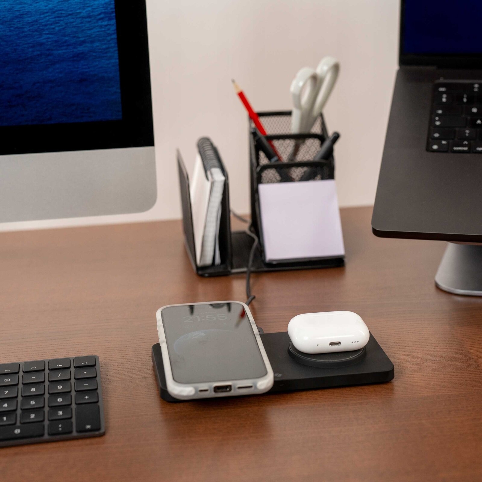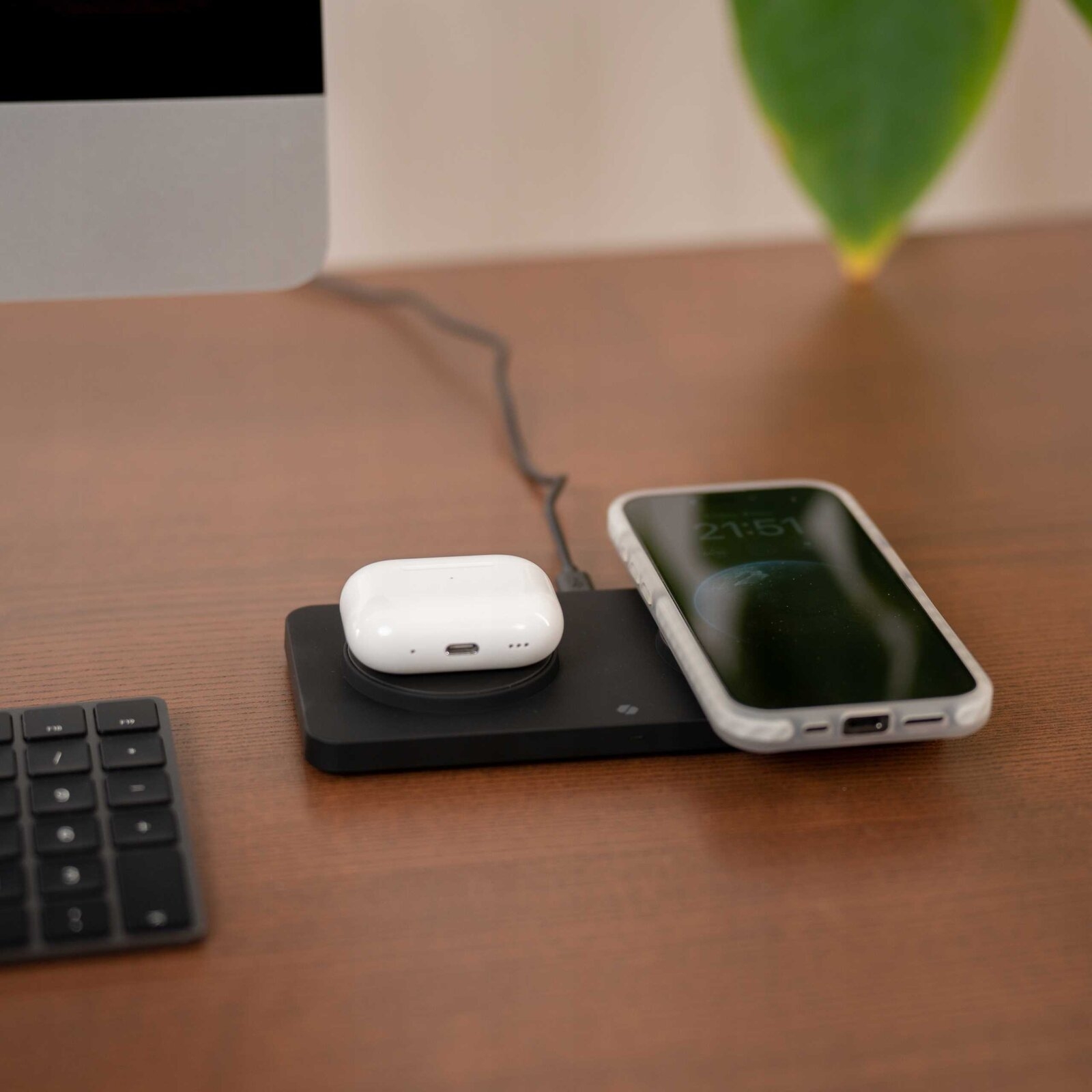 Οι ενσωματωμένοι μαγνήτες εξασφαλίζουν την ακριβή τοποθέτηση και τη σταθερότητα των συσκευών σας, παρέχοντας αξιόπιστη και αποτελεσματική φόρτιση κάθε φορά. Με δύο ξεχωριστές περιοχές φόρτισης, μπορείτε να φορτίσετε ταυτόχρονα το iPhone σας και τα ακουστικά σας, καθιστώντας τη διαδικασία της φόρτισης όχι μόνο εύκολη αλλά και απόλυτα πρακτική.