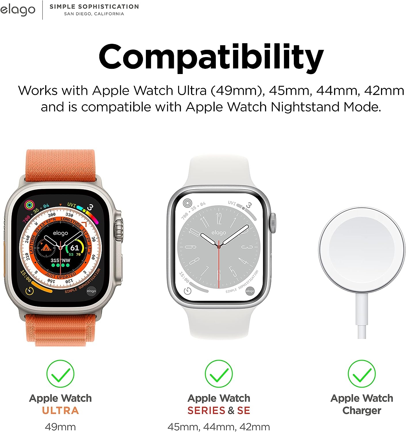 Παρέχει συμβατότητα με τα Apple Watch και συγκεριμένα με τα ακόλουθα: Apple Watch Ultra2/Ultra1/SE/9/8/7/6/5/4/3/2/1 (49/45/44/42). Ταυτόχρονα, είναι συμβατή και με τη λειτουργία Watch Nightstand Mode. Περιέχει ειδική εγκοπή για την εφαρμογή του φορτιστή του Apple Watch, η οποία είναι στην εσωτερική μεριά της βάσης και δεν χαλάει καθόλου την εμφάνιση της.