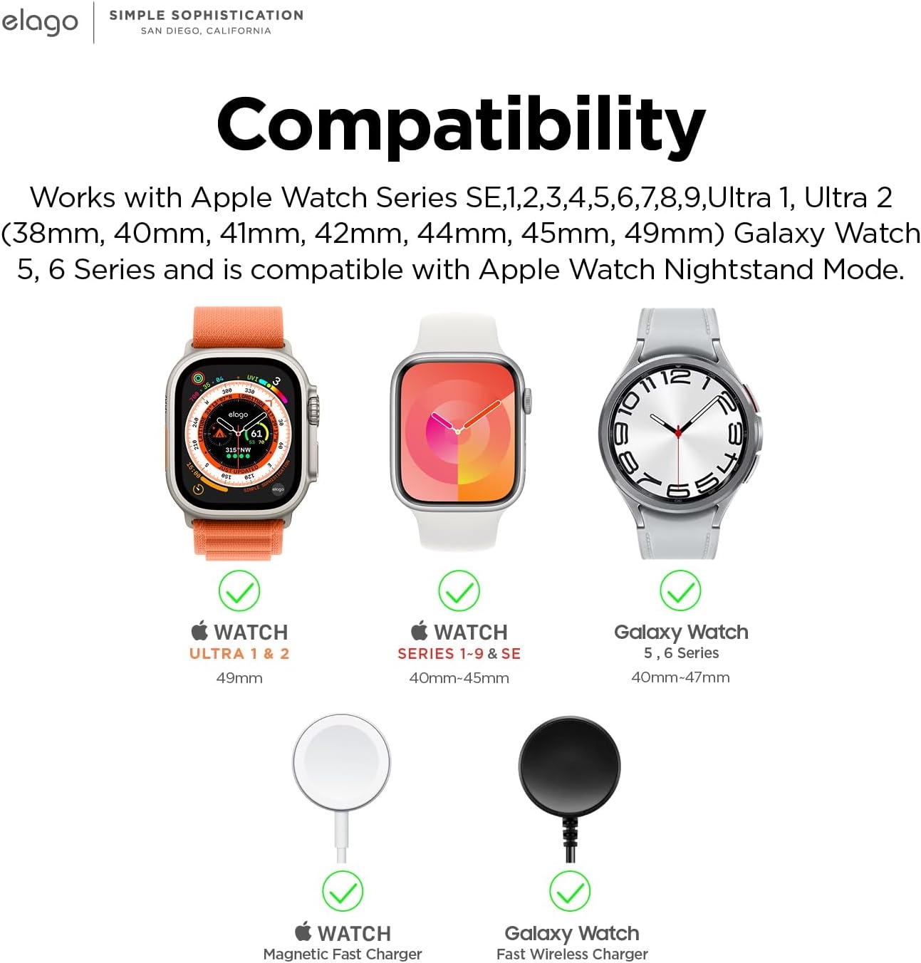 Παρέχει συμβατότητα με τα Apple Watch & Samsung Galaxy Watch και συγκεριμένα με τα ακόλουθα: Apple Watch Ultra2/Ultra1/SE/10/9/8/7/6/5/4/3/2/1 (49/45/44/42/41/40/38mm) και Samsung Galaxy Watch 5 / 5 Pro. Ταυτόχρονα, είναι συμβατή και με τη λειτουργία Watch Nightstand Mode. Περιέχει ειδική εγκοπή για την εφαρμογή του φορτιστή του Apple Watch ή Galaxy Watch, η οποία είναι στην εσωτερική μεριά της βάσης και δεν χαλάει καθόλου την εμφάνιση της.