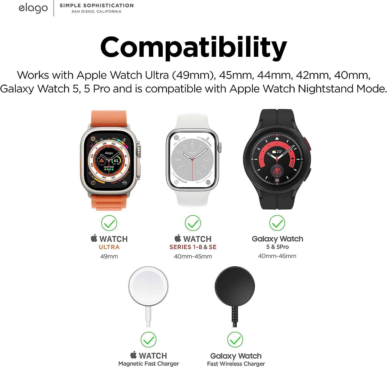 Παρέχει συμβατότητα με τα Apple Watch & Samsung Galaxy Watch και συγκεριμένα με τα ακόλουθα: Apple Watch Ultra2/Ultra1/SE/10/9/8/7/6/5/4/3/2/1 (49/46/45/44/42/41/40/38mm) και Samsung Galaxy Watch 5 / 5 Pro. Ταυτόχρονα, είναι συμβατή και με τη λειτουργία Watch Nightstand Mode. Περιέχει ειδική εγκοπή για την εφαρμογή του φορτιστή του Apple Watch ή Galaxy Watch, η οποία είναι στην εσωτερική μεριά της βάσης και δεν χαλάει καθόλου την εμφάνιση της.