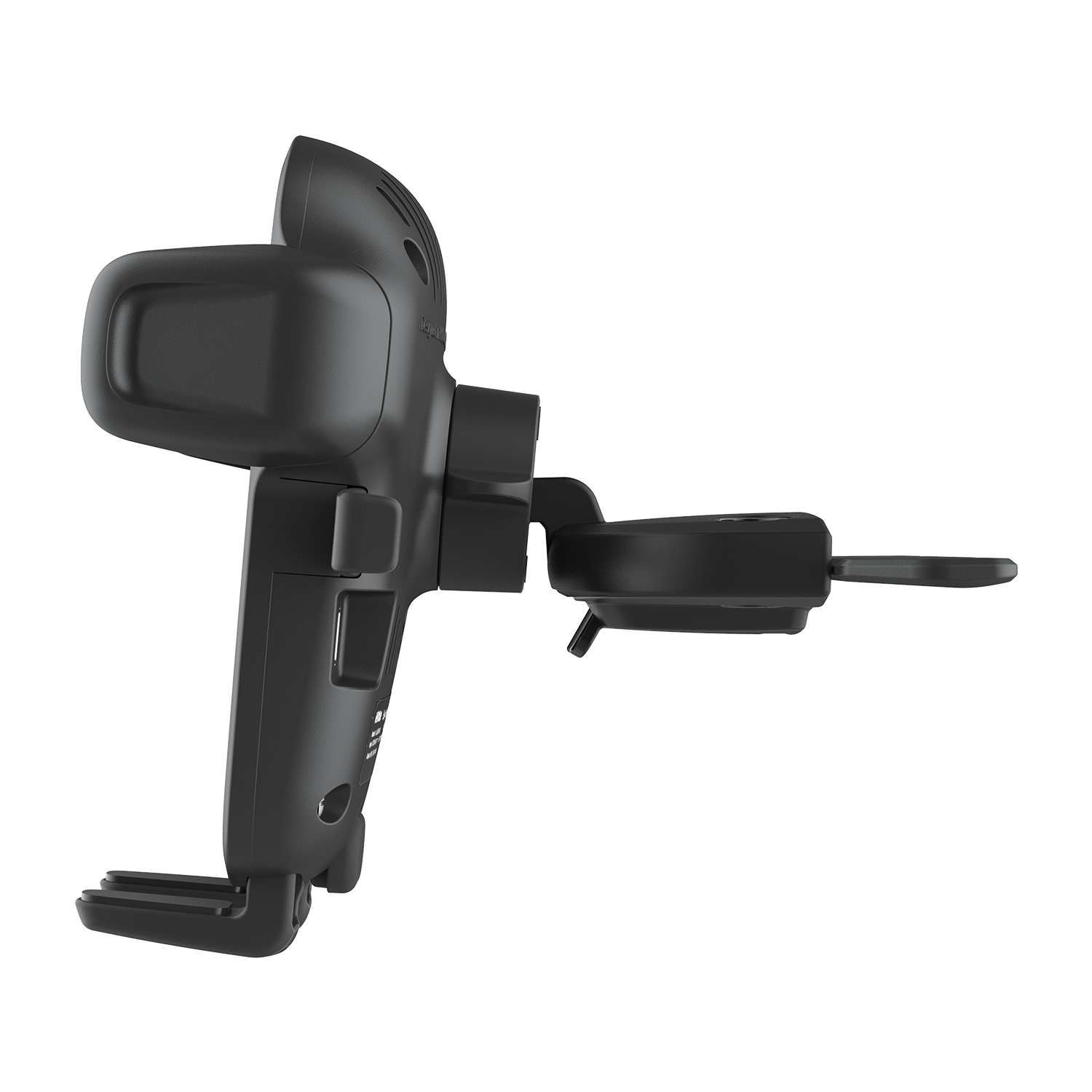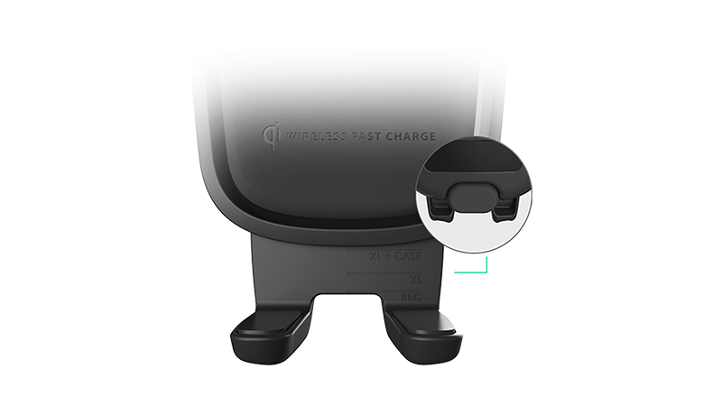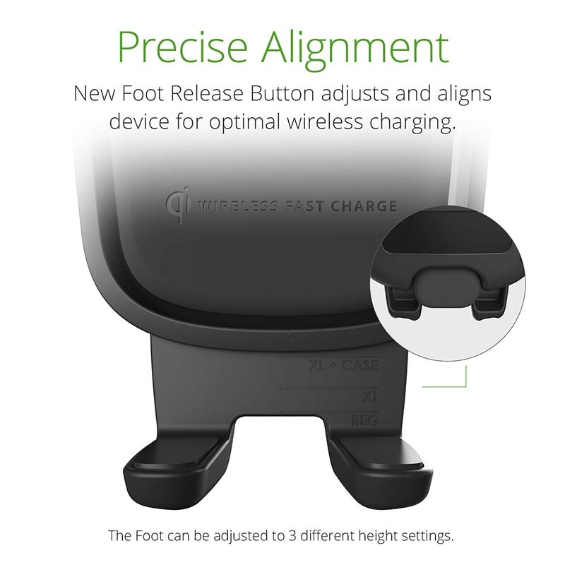 Το κάτω πόδι στήριξης ρυθμίζεται μέσω ενός κουμπιού και μπορεί να χαμηλώσει για να βοηθήσει στην τοποθέτηση των μεγάλων συσκευών με οθόνες μεγέθους έως 6.7". Αυτό επίσης βοηθά στην ευθυγράμμιση των πηνίων Qi για μια αποτελεσματική εμπειρία φόρτισης. Προσφέρει ισχύ και ευελιξία στο δρόμο για ασφαλέστερη οδηγική εμπειρία σε οποιοδήποτε όχημα.