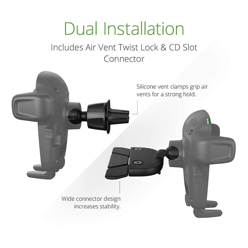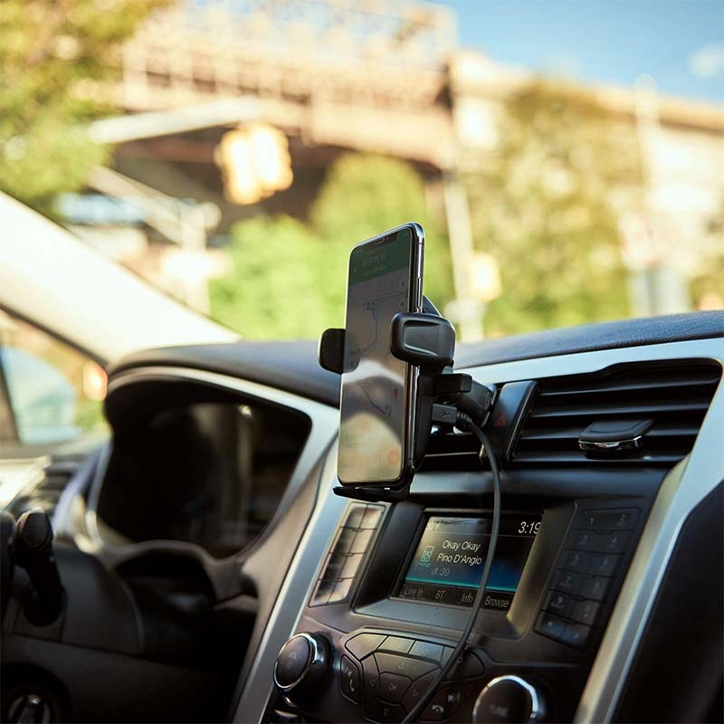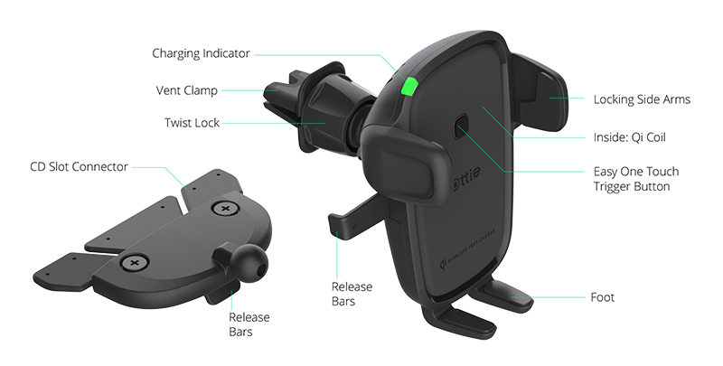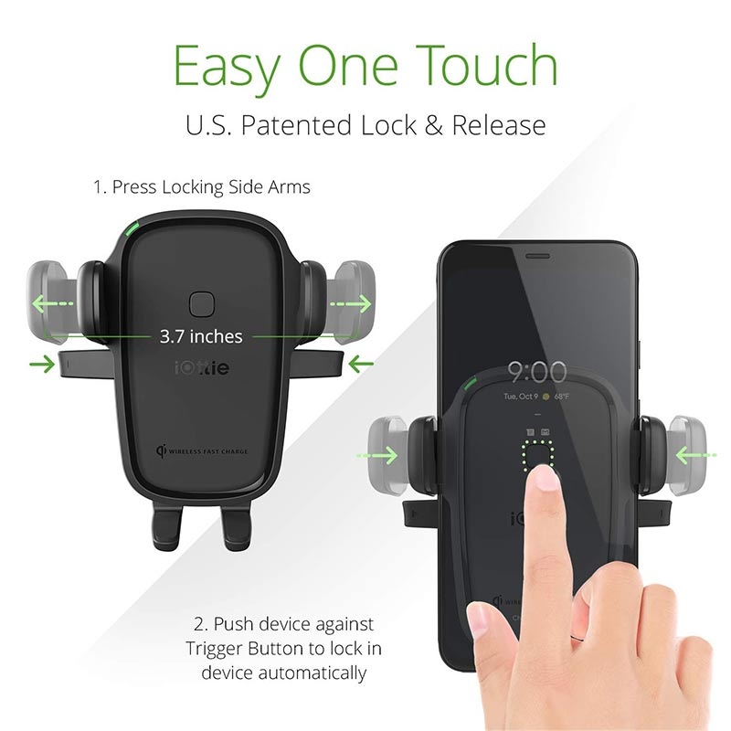 Τοποθετήστε το smartphone σας πάνω στη βάση, μέσα σε δευτερόλεπτα χάρη στον πατενταρισμένο μηχανισμό Easy One Touch των ΗΠΑ. Απλώς πατήστε τους βραχίονες κλειδώματος και πιέστε τη συσκευή πάνω στο κουμπί της Easy One Touch για να ασφαλίσετε αυτόματα το τηλέφωνο. Μόλις το smartphone κλειδώσει στη θέση του, η τεχνολογία ασύρματης φόρτισης Qi παρέχει ισχύ στη συσκευή σας χωρίς την ανάγκη πρόσθετων καλωδίων φόρτισης.