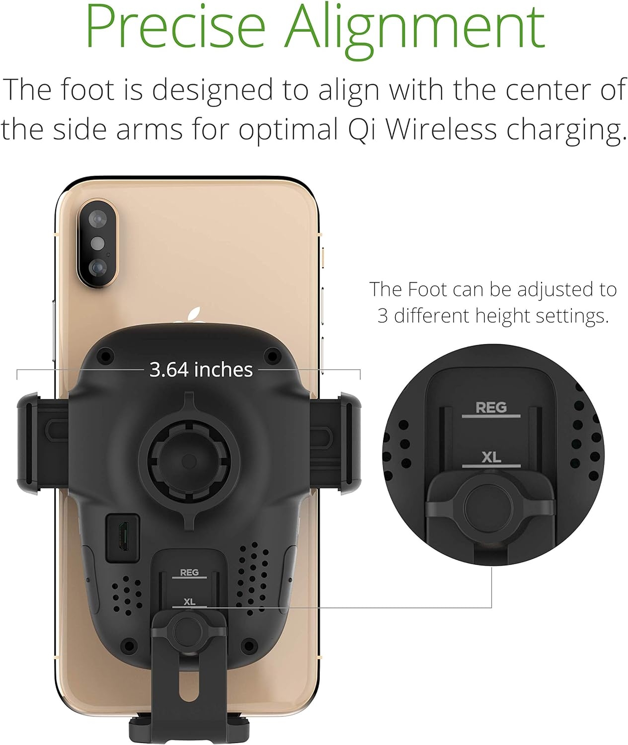 Το κάτω πόδι στήριξης ρυθμίζεται μέσω ενός κουμπιού και μπορεί να χαμηλώσει για να βοηθήσει στην τοποθέτηση των μεγάλων συσκευών με οθόνες μεγέθους έως 6.5". Αυτό επίσης βοηθά στην ευθυγράμμιση των πηνίων Qi για μια αποτελεσματική εμπειρία φόρτισης. Προσφέρει ισχύ και ευελιξία στο δρόμο για ασφαλέστερη οδηγική εμπειρία σε οποιοδήποτε όχημα.