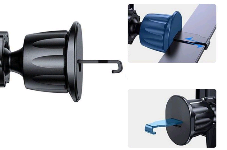 Η περιστρεφόμενη κεφαλή κατά 360° προσφέρει απόλυτη ελευθερία διαμόρφωσης, επιτρέποντάς σας να προσαρμόσετε τη συσκευή στις ανάγκες σας με ευκολία. Ο γάντζος σας επιτρέπει τη στερέωση σε οποιαδήποτε γρίλια του αυτοκινήτου, εξασφαλίζοντας σταθερότητα και ασφάλεια.