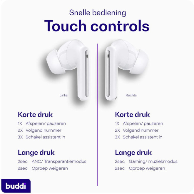 Επεξήγηση Χειριστηρίων Αφής Buddi Pulse: Αριστερό Ακουστικό: Πατήστε σύντομα μία φορά: Αναπαραγωγή / Παύση, Πατήστε σύντομα δύο φορές: Προηγούμενο κομμάτι, Πατήστε σύντομα τρεις φορές: Ενεργοποίηση φωνητικού βοηθού, Παρατεταμένο πάτημα (2 δευτ.): Λειτουργία ANC / Διαφάνειας / Απάντηση ή απόρριψη κλήσης. Δεξί Ακουστικό: Πατήστε σύντομα μία φορά: Αναπαραγωγή / Παύση, Πατήστε σύντομα δύο φορές: Επόμενο κομμάτι, Πατήστε σύντομα τρεις φορές: Ενεργοποίηση φωνητικού βοηθού, Παρατεταμένο πάτημα (2 δευτ.): Λειτουργία μουσικής / Λειτουργία παιχνιδιού / Απάντηση ή απόρριψη κλήσης.