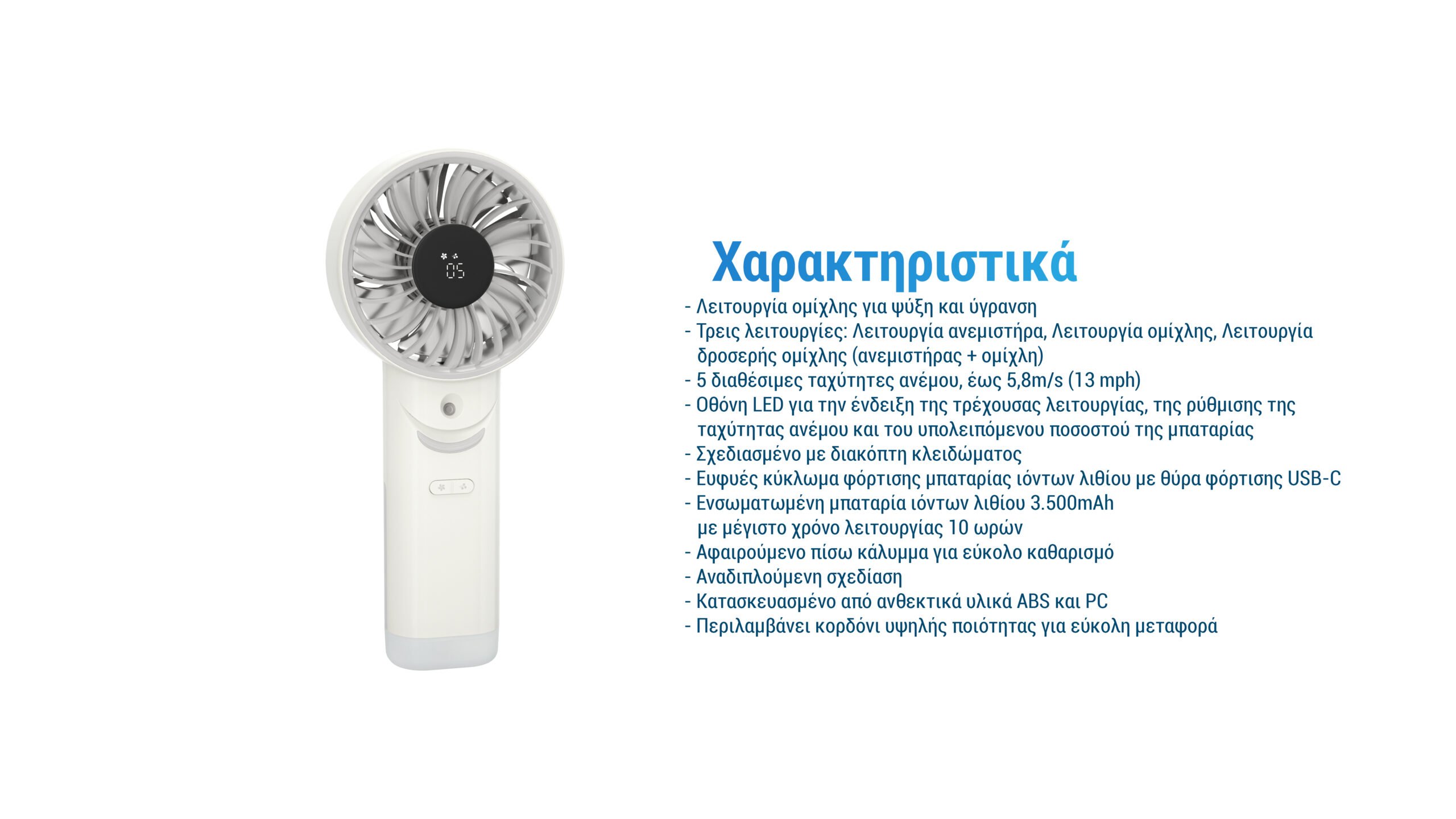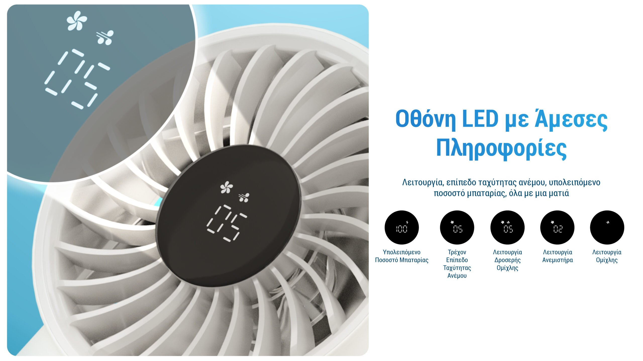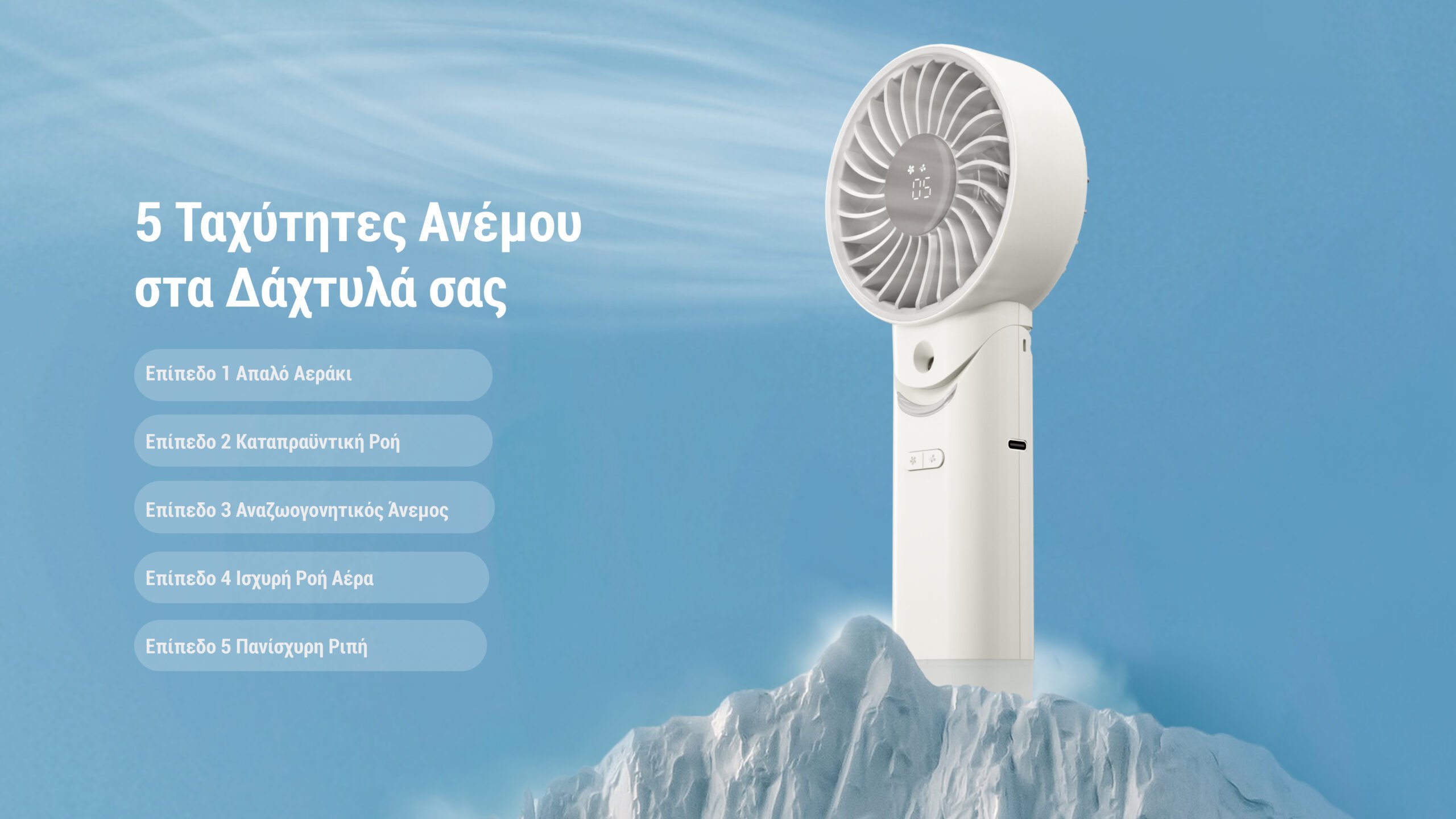 Με ισχυρή ροή αέρα έως 5,8 m/s (13 mph), προσφέρει δροσιά ακόμα και στις πιο ζεστές ημέρες. Διαθέτει 5 ταχύτητες ανέμου, δηλαδή απαλό αεράκι, καταπραϋντική ροή, αναζωογονητικό άνεμο, ισχυρή ροή αέρα και πανίσχυρη ριπή. Επιπλέον, διαθέτει LED οθόνη πραγματικού χρόνου και μέγιστη διάρκεια λειτουργίας των 10 ωρών, ώστε να σας χαρίζει ελευθερία κινήσεων χωρίς περιορισμούς, ενώ είναι ιδανικός για χρήση σε μετακινήσεις, ορειβασία, πεζοπορία, στο σπίτι, ταξίδια, πικ-νικ και κατασκήνωση.