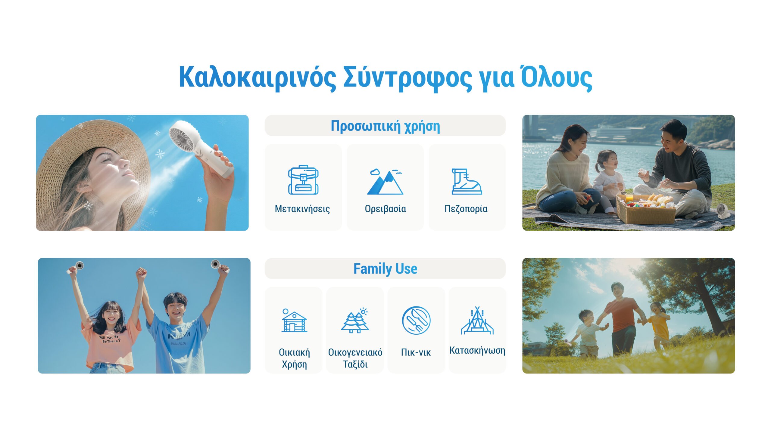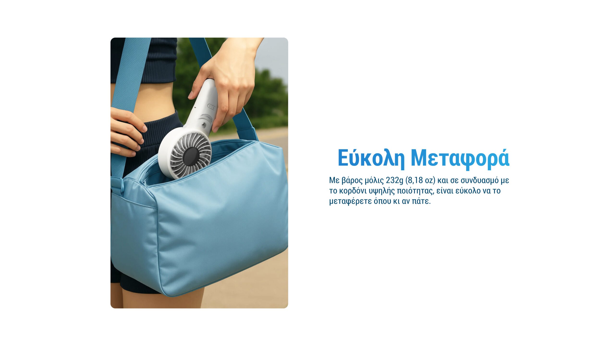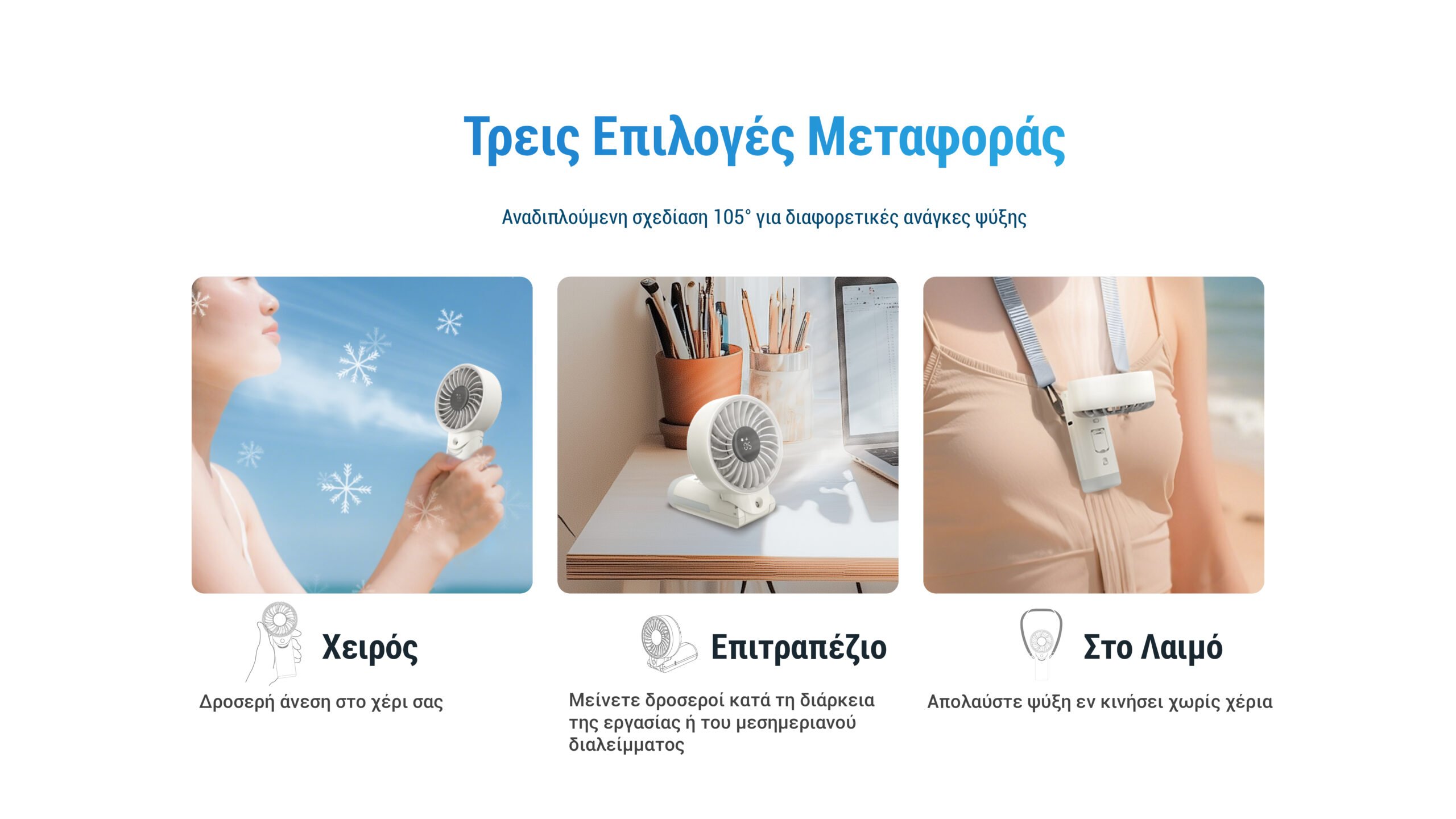 Με ισχυρή ροή αέρα έως 5,8 m/s (13 mph), προσφέρει δροσιά ακόμα και στις πιο ζεστές ημέρες. Διαθέτει 5 ταχύτητες ανέμου, δηλαδή απαλό αεράκι, καταπραϋντική ροή, αναζωογονητικό άνεμο, ισχυρή ροή αέρα και πανίσχυρη ριπή. Επιπλέον, διαθέτει LED οθόνη πραγματικού χρόνου και μέγιστη διάρκεια λειτουργίας των 10 ωρών, ώστε να σας χαρίζει ελευθερία κινήσεων χωρίς περιορισμούς, ενώ είναι ιδανικός για χρήση σε μετακινήσεις, ορειβασία, πεζοπορία, στο σπίτι, ταξίδια, πικ-νικ και κατασκήνωση.