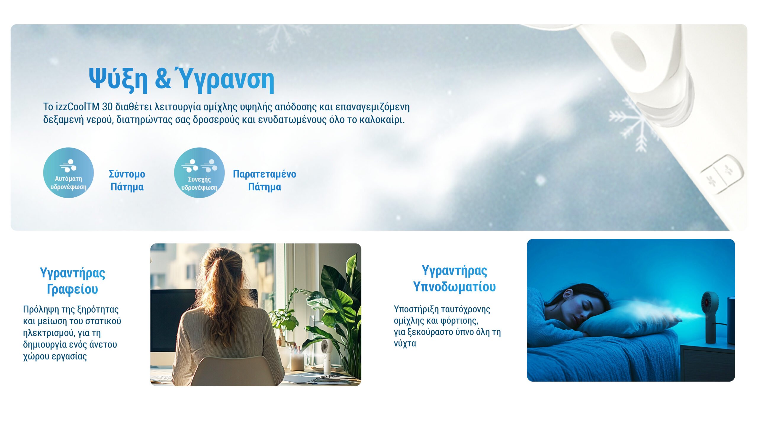 Σας προσφέρει ψύξη και ύγρανση, ώστε να απολαμβάνεται την ιδανική δροσιά και ενυδάτωση με τη λειτουργία υψηλής απόδοσης ομίχλης και την επαναγεμιζόμενη δεξαμενή νερού. Ενεργοποιείστε την αυτόματη υδρονέφωση με ένα σύντομο πάτημα ή πατήστε παρατεταμένα για συνεχή υδρονέφωση.