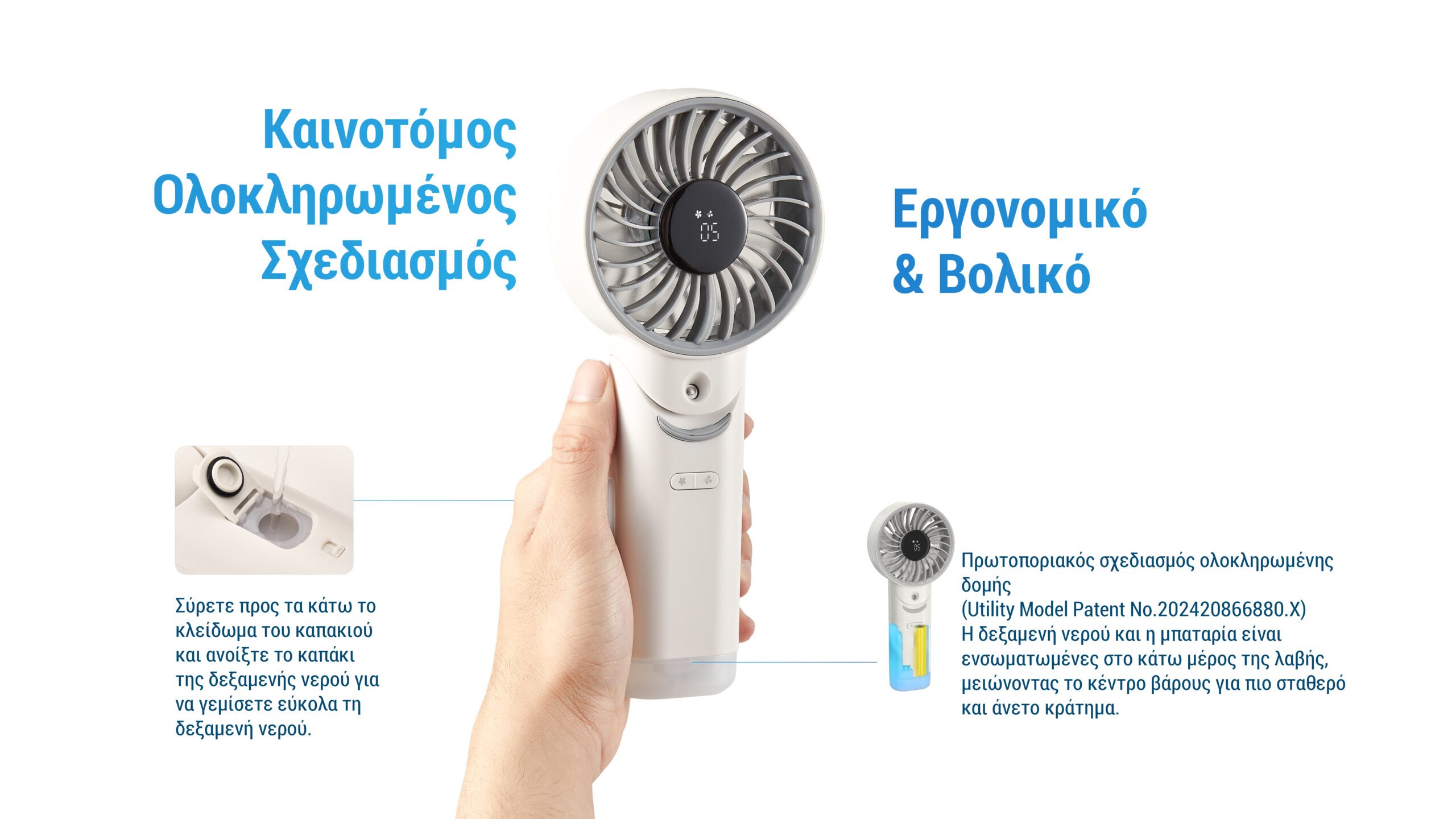 Ο πρωτοποριακός του σχεδιασμός ολοκληρωμένης δομής (Utility Model Patent No. 202420866880.X) προσφέρει ευκολία και άνεση στη χρήση. Με μια απλή κίνηση, σύρετε προς τα κάτω το κλείδωμα του καπακιού, ανοίξτε το καπάκι της δεξαμενής νερού και γεμίστε εύκολα τη δεξαμενή νερού. Η δεξαμενή νερού και η μπαταρία είναι ενσωματωμένες στο κάτω μέρος της λαβής, μειώνοντας το κέντρο βάρους για πιο σταθερό, εργονομικό και άνετο κράτημα.