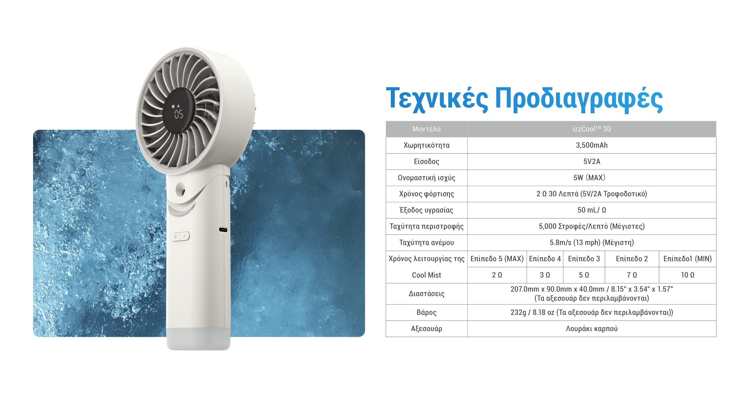 Απόλαυσε την απόλυτη αίσθηση δροσιάς με τα τριπλά χαρακτηριστικά ψύξης του izzCool 30! Σχεδιασμένος για να μην φοβάται τη ζέστη, διαθέτει μία δυναμική σχεδίαση ροής αέρας και επτά πτερύγια υψηλής ταχύτητας με χαμηλό θόρυβο, προσφέροντας ισχυρή, αθόρυβη και αναζωογονητική εμπειρία ψύξης. Με αναδιπλούμενο σχεδιασμό 105° και κορδόνι υψηλής ποιότητας, προσφέρει τρεις διαφορετικές επιλογές μεταφοράς, στο χέρι, στον λαιμό ή επιτραπέζιο, έτσι σας κρατά δροσερούς όπου κι αν βρίσκεστε, όποτε το χρειάζεστε.