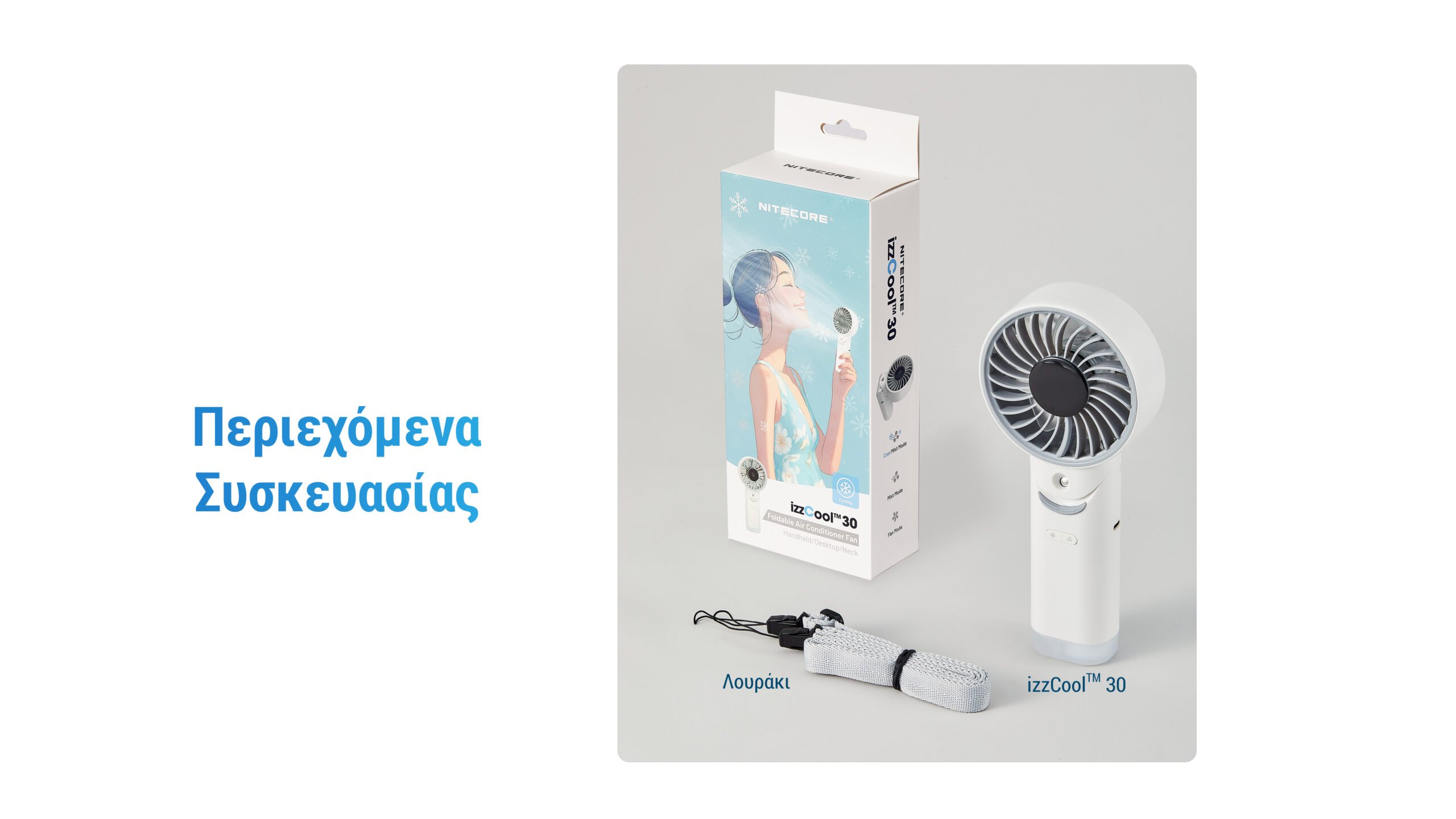 Η συσκευασία περιλαμβάνει: 1 x Ανεμιστήρας Nitecore izzCool 30, 1 x Λουράκι Λαιμού.