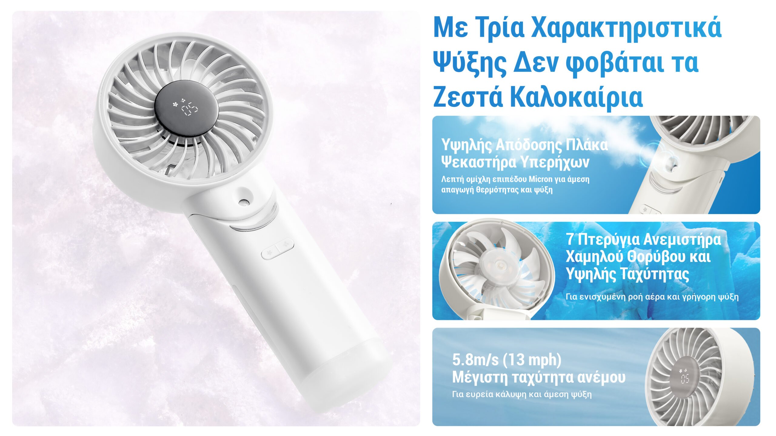 Είναι σαν ένα φορητό κλιματιστικό, καθώς διαθέτει μία πλάκα ψεκασμού υπερήχων υψηλής απόδοσης, η οποία παρέχει μία λεπτή ομίχλη επιπέδου micron, η οποία διαχέει αποτελεσματικά τη θερμότητα, προσφέροντάς σας μία αίσθηση δροσιάς σαν να μπαίνετε σε έναν κλιματιζόμενο χώρο. Ο ανεμιστήρας διαθέτει 7 πτερύγια υψηλής ταχύτητας, για την άφθονη και ομαλή ροή αέρα με χαμηλά επίπεδα θορύβου. Είναι ο ιδανικός φορητός σύντροφος για το καλοκαίρι!