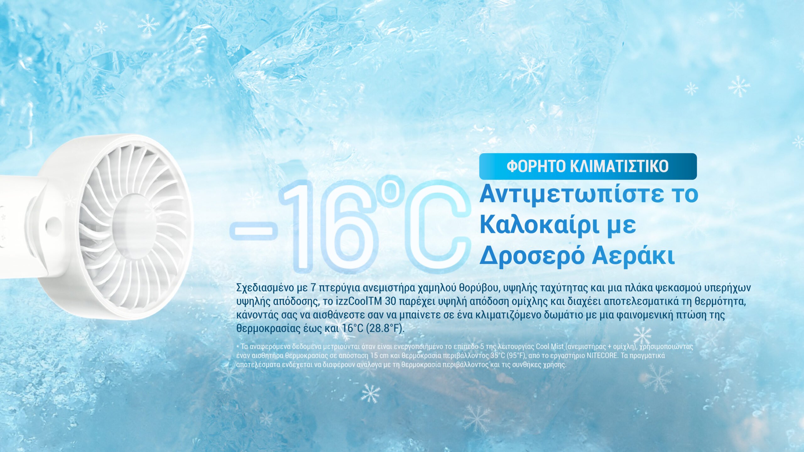 Σύμφωνα με μετρήσεις του εργαστηρίου της Nitecore, μπορεί να επιτύχει φαινομενική πτώση της θερμοκρασίας έως και 16°C, όταν λειτουργεί στο επίπεδο 5 της λειτουργίας "Cool Mist" (συνδυασμός ανεμιστήρα και ομίχλης). Ο μοντέρνος σχεδιασμός του τον καθιστά ιδανικό τόσο για το γραφείο όσο και για τις εξωτερικές σας δραστηριότητες. Με τον izzCool 30, έχετε πάντα ένα δροσερό αεράκι μαζί σας, ώστε να απολαμβάνετε την καλοκαιρινή σας καθημερινότητα με άνεση!